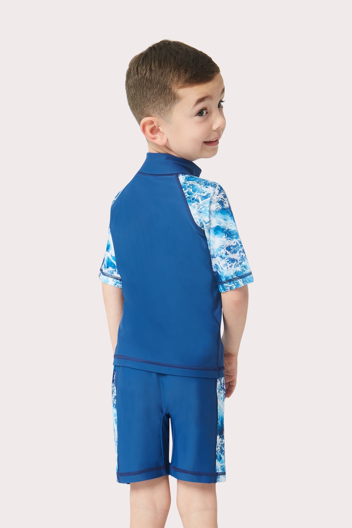بدلة السباحة المفضلة لابنك المكونة من قطعتين بتصميم جديد تمامًا. طقم مكون من قطعتين متطابقتين مع شورت سباحة وقميص راش جارد، سيصبحان ملابس السباحة المفضلة الجديدة لابنك. بتصميم Navy-Blue Wave الجديد تمامًا، يأتي قميص راش جارد بأكمام قصيرة والشورت باللون الأزرق البحري، مع أنماط Navy Wave على أكمام قميص راش جارد، ونمط Navy Wave على جانب الشورت.