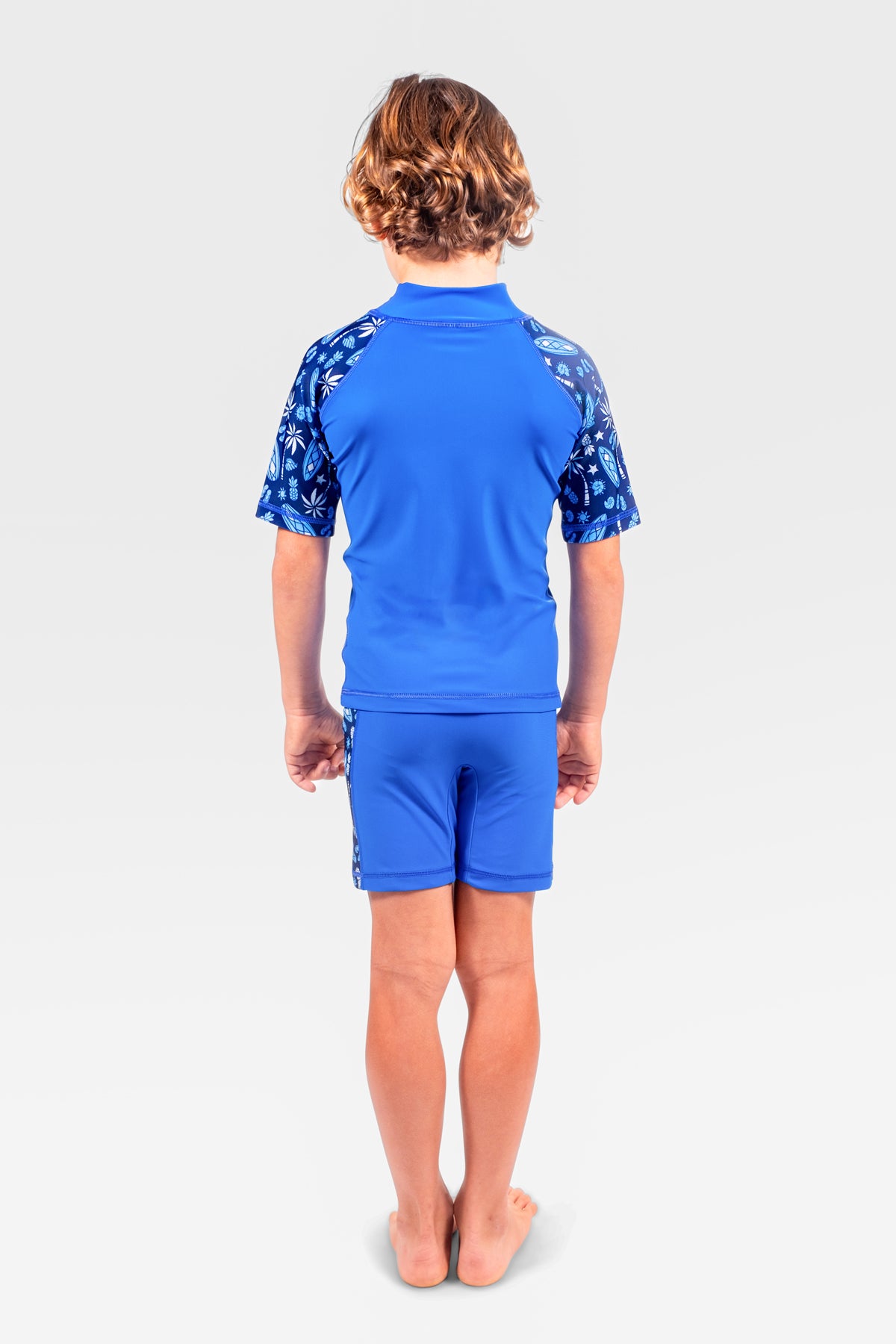 A matching Two Piece Set with Shorts and Rash guard that are going to be your son's new favorite swimwear. The Short sleeve Rash Guard and shorts are nautical blue, with Navy Blue Surf patterns on the sleeves of the Rash Guard, and Navy Blue Surf pattern on the side of the shorts.