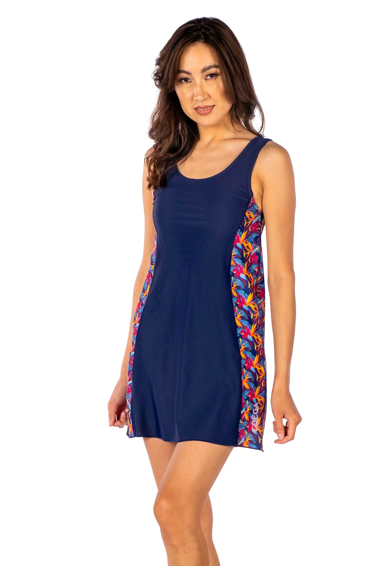 احصلي على إطلالة رائعة على الشاطئ أو حمام السباحة بارتداء فستان السباحة الجذاب هذا مع بدلة سباحة مدمجة وحمالة صدر أسفلها لتوفير دعم إضافي وتغطية وحماية من الشمس. مصنوع من قماش ناعم قابل للتمدد، يتميز فستان السباحة بفتحة رقبة دائرية وتصميم فريد من نوعه للوحة الجانبية.