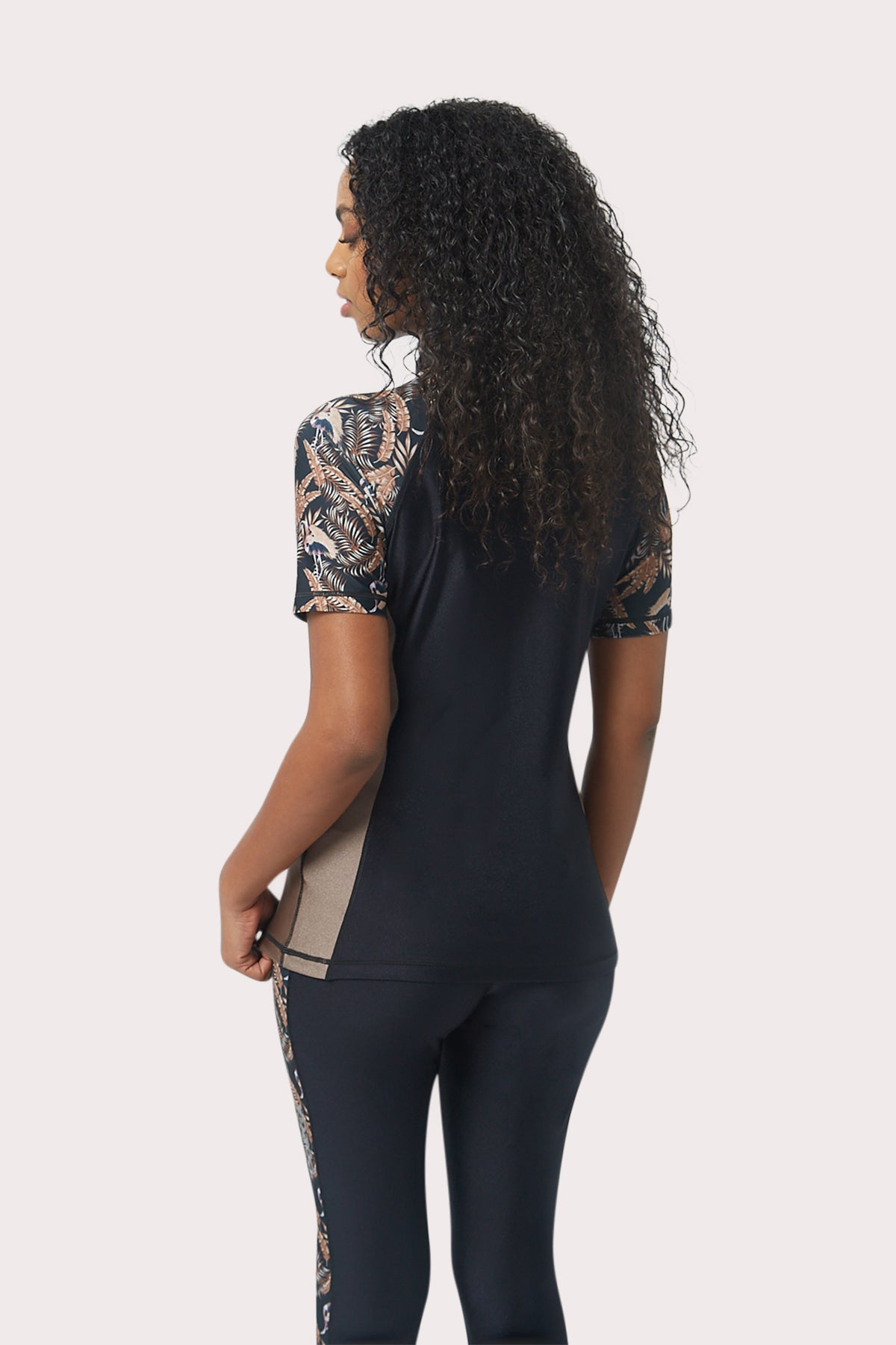 يأتي هذا القميص الواقي من الطفح الجلدي بأكمام قصيرة بنمط ألوان جديد تمامًا مع قاعدة سوداء داكنة مع نمط فلامنغو ذهبي جديد تمامًا على طول الجانبين يتألف من درجات اللون الذهبي والبني. هذا القميص الواقي من الطفح الجلدي مصنوع من مواد قابلة للتمدد وناعمة، ويتميز هذا القميص الواقي من الطفح الجلدي بأكمام قصيرة بملمس جلدي ثانٍ، ولن ترغب أبدًا في خلعه. إلى جانب هذه الراحة التي لا مثيل لها، يتميز هذا القميص الواقي من الطفح الجلدي بأكمام طويلة بحماية مدمجة من الأشعة فوق البنفسجية لضمان بقائك محميًا من الأشعة فوق البنفسجية الضارة.