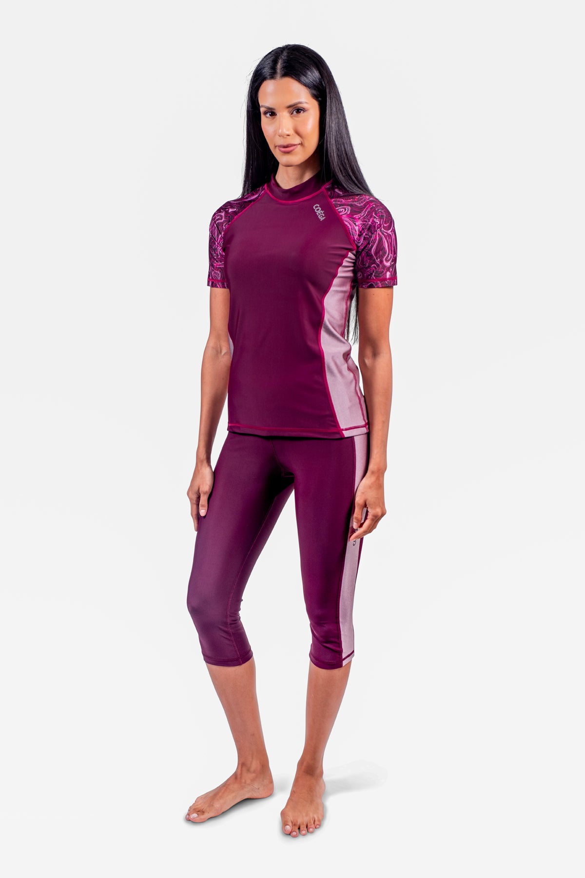 Dive into style and protection with the ultimate Short-Sleeve Rash Guard. Crafted by our expert in-house designers, this Short-Sleeve Rash Guard has a sleek feminine fit from the tailored stitched side panels, accentuating your silhouette while allowing maximum freedom of movement. Apart from this unparalleled flattering fit, the Short-Sleeve Rash Guard is made from high-performance UV protective material to shield you from harmful UV rays while you enjoy all your aquatic activities. It's longer in length providing your torso with extra coverage, and the innovative shoulder-length raglan sleeve reduces bulk under the arms, enhancing overall comfort and mobility. The Short-Sleeve Rash Guard combines elegance with essential UV protection, making it the ultimate choice for performance and style.