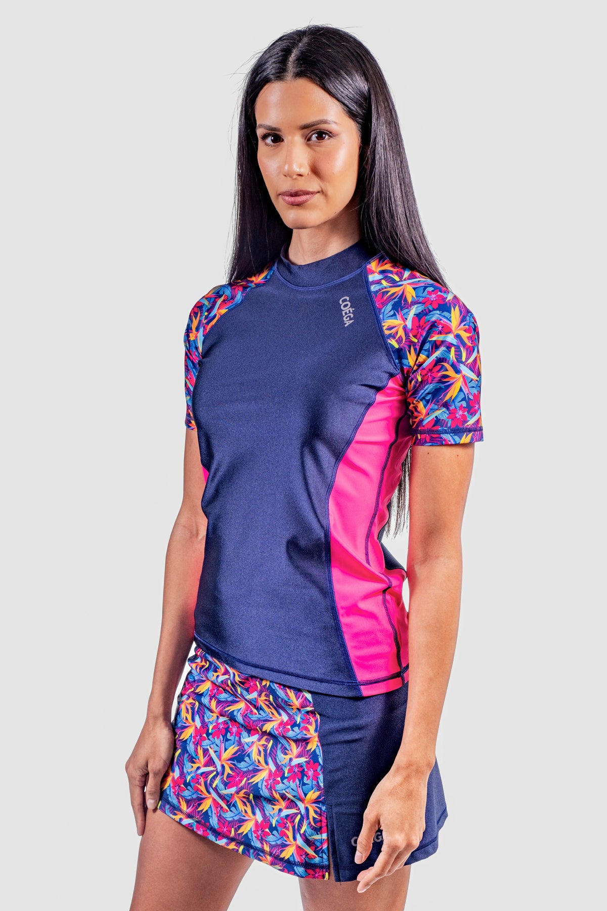 Dive into style and protection with the ultimate Short-Sleeve Rash Guard. Crafted by our expert in-house designers, this Short-Sleeve Rash Guard has a sleek feminine fit from the tailored stitched side panels, accentuating your silhouette while allowing maximum freedom of movement. Apart from this unparalleled flattering fit, the Short-Sleeve Rash Guard is made from high-performance UV protective material to shield you from harmful UV rays while you enjoy all your aquatic activities. It's longer in length providing your torso with extra coverage, and the innovative shoulder-length raglan sleeve reduces bulk under the arms, enhancing overall comfort and mobility. The Short-Sleeve Rash Guard combines elegance with essential UV protection, making it the ultimate choice for performance and style.