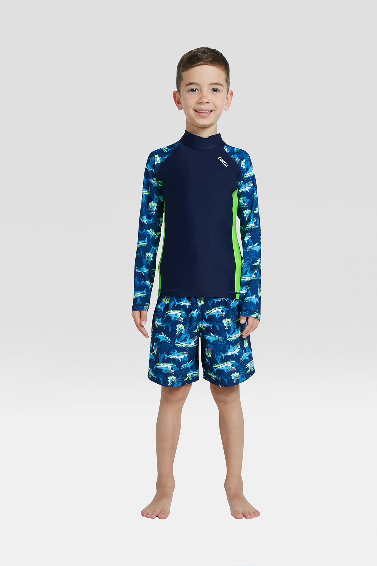 The Rash Guard was designed by our expert in-house designers who wanted to create a 3 in 1 Rash Guard, one that provided versatility, extra comfort and protection against the sun. Especially designed for the kids who burn a little easier on the hotter days. For enhanced movement, the Rash Guard is designed to have a higher neckline with raglan long sleeves to minimize bulk of fabric under the arms.