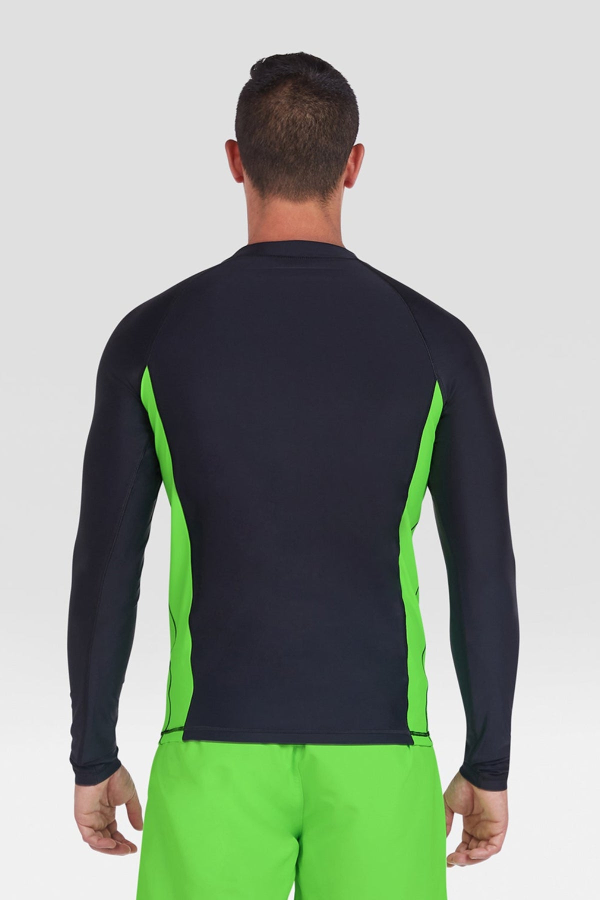 This Long-Sleeve Rash Guard comes with a jet-black base and a neon green color down the side panels. It is the ultimate blend of modern flair, perfect for those who want a playful twist.