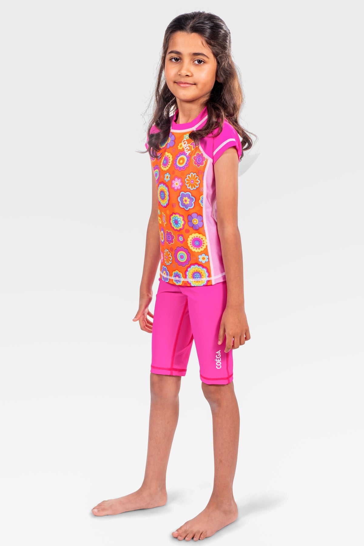 Dive into style and protection with the ultimate Cap-Sleeve Rash Guard in our all-new Pink Orange Groovy color story, with vibrant pink sleeves and dynamic flower pattern on the front. Crafted by our expert in-house designers, this girls Cap-Sleeve Rash Guard is made from premium quality fabric to ensure the longevity of your daughter€™s swimwear even with exposure to chlorine and saltwater, allowing your little one to enjoy all their aquatic adventures without compromising their swimwear.