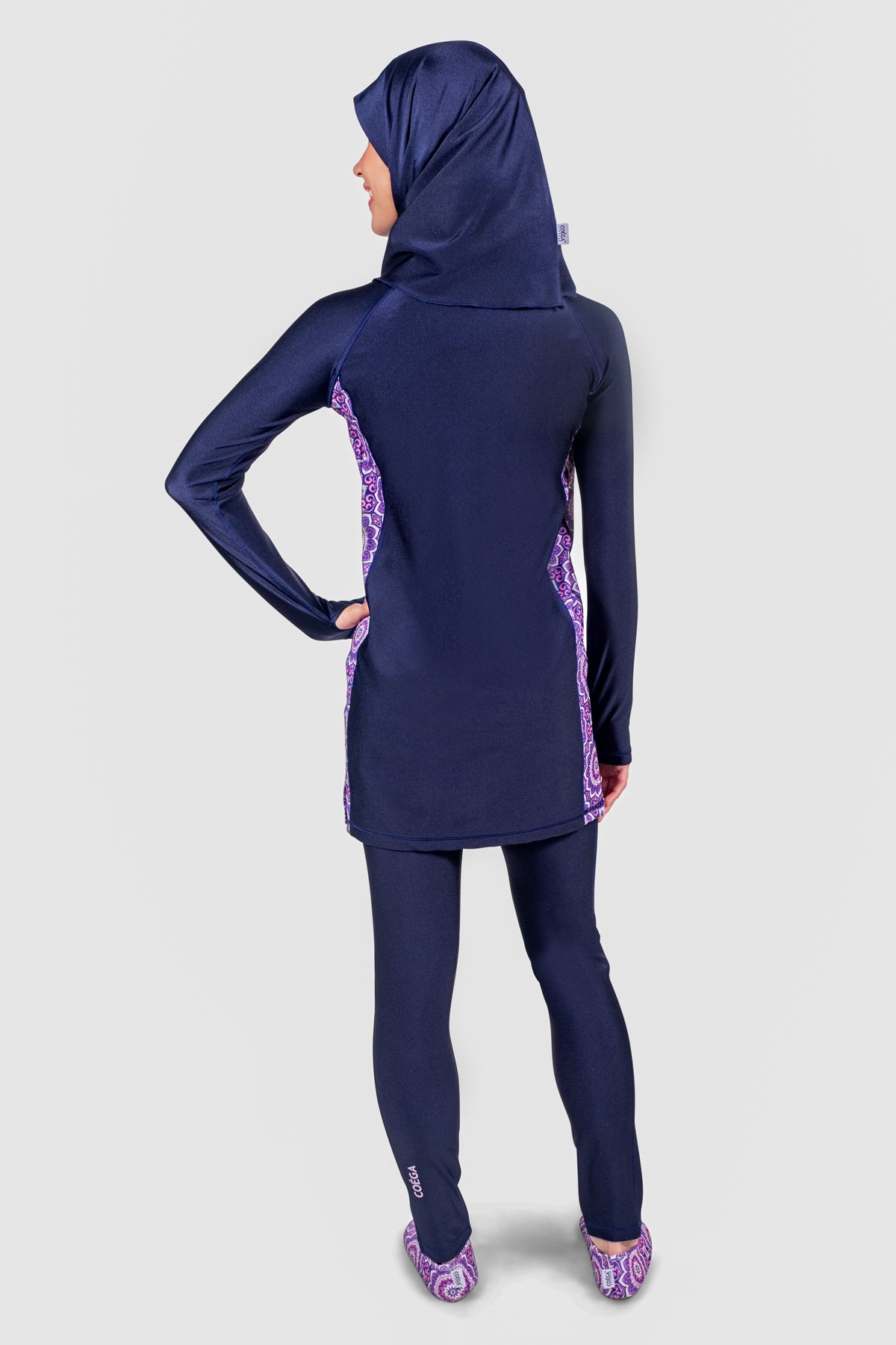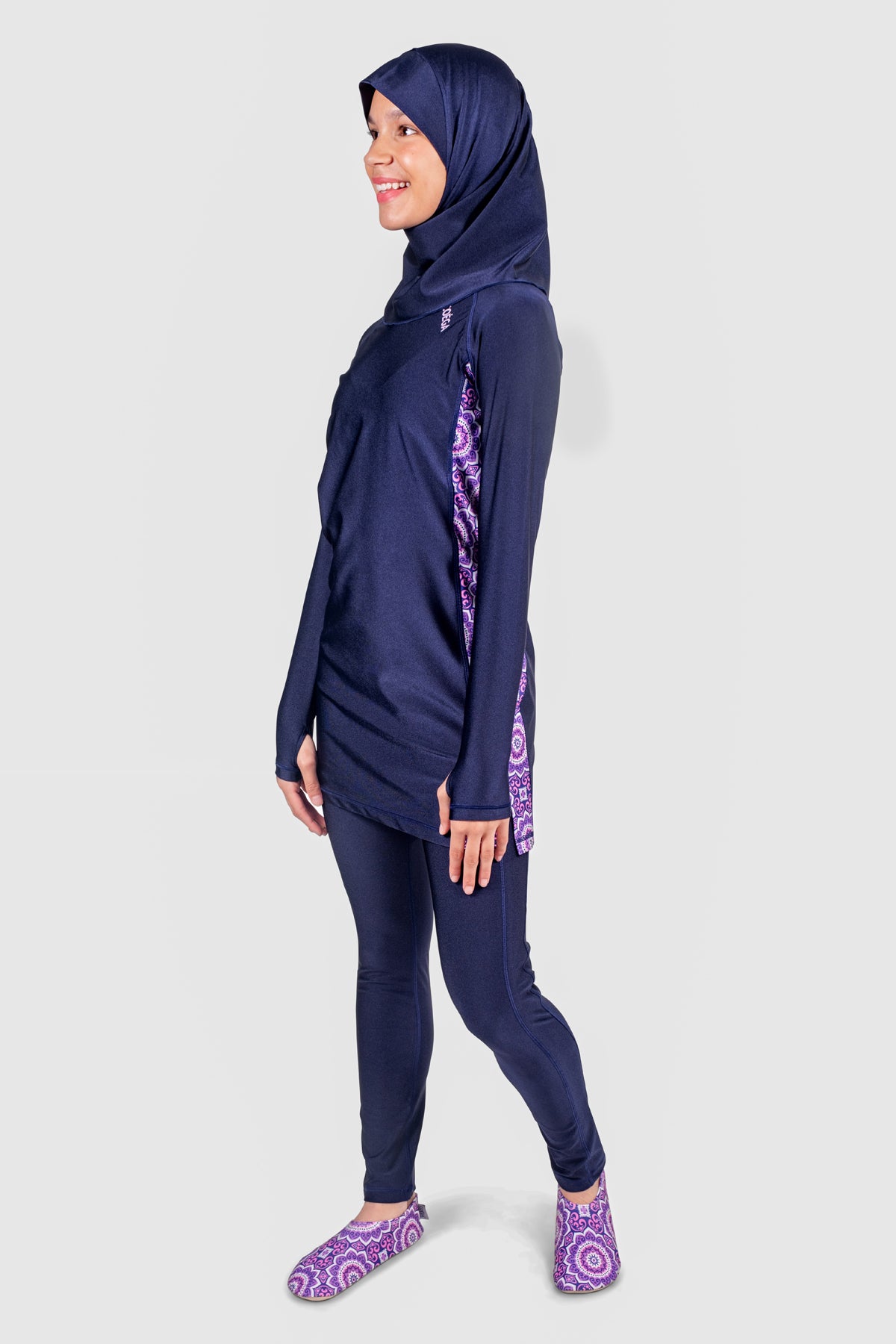 This unique 3-piece modesty set in Pink Mandala includes full-length Swim Tights, Swim Tunic and Shaela. Ideal for lounging by the poolside or aquatic activities, this versatile set provides a sophisticated and timeless look whilst offering excellent sun protection.