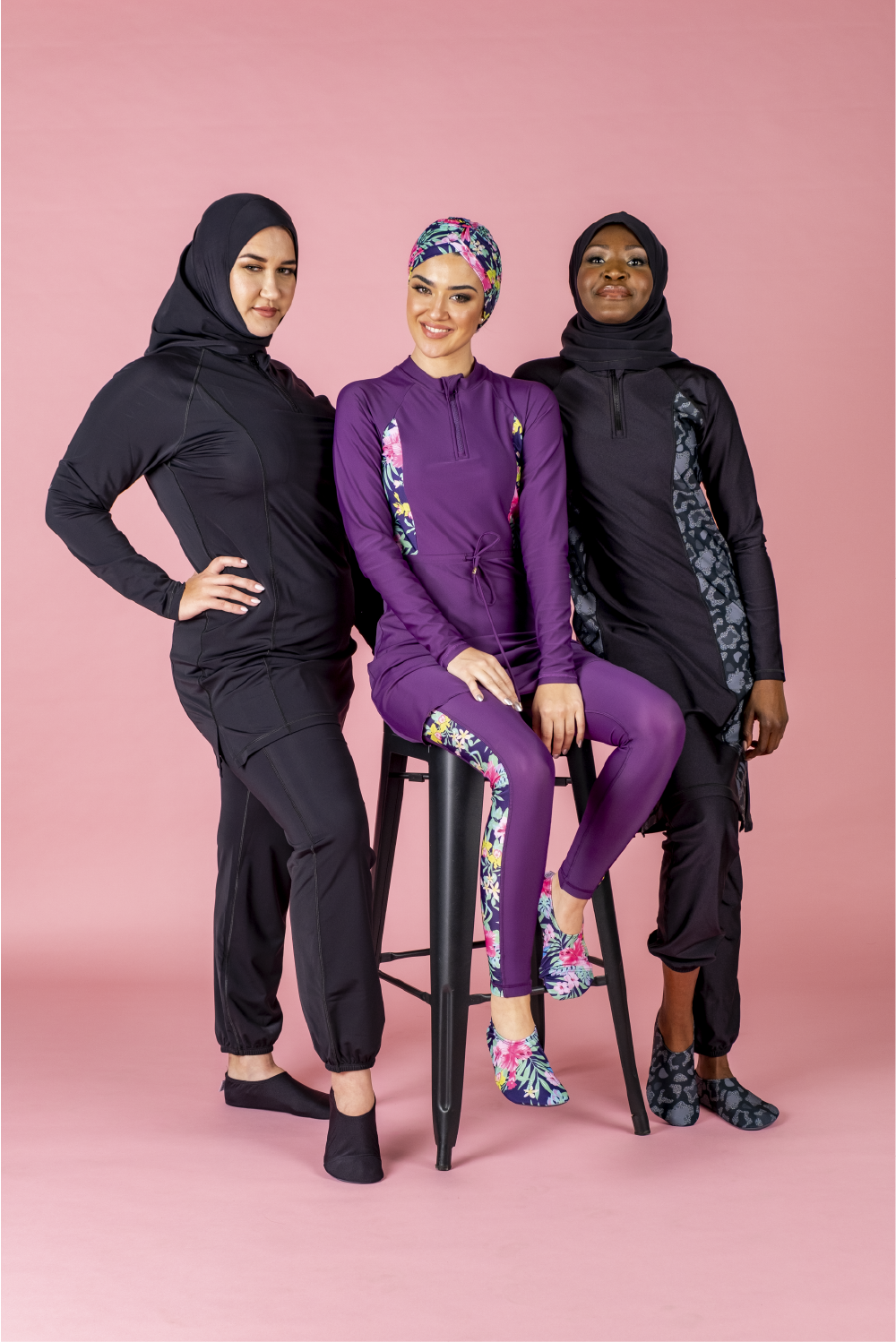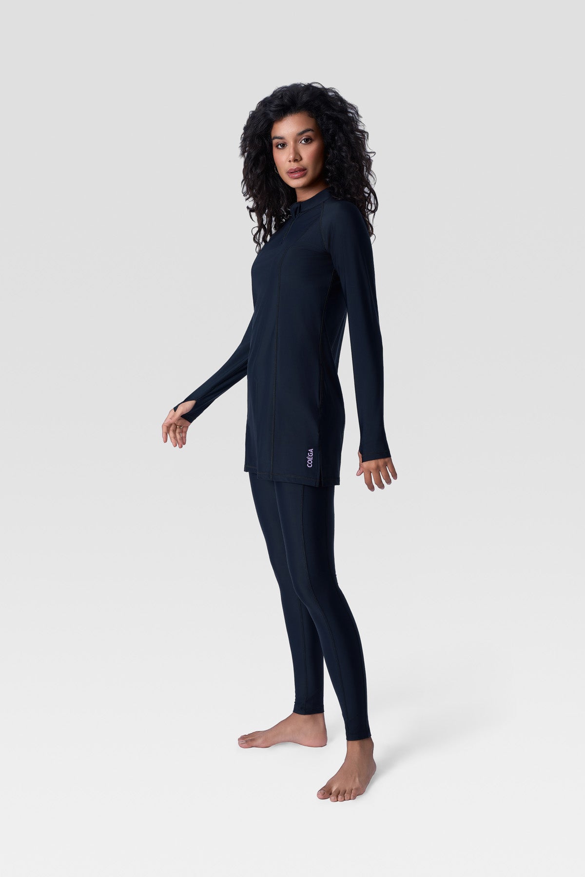 سترة السباحة القابلة للتمدد والناعمة فضفاضة مع دعم مدمج مع حشوة حمالة صدر وطول يصل إلى منتصف الفخذ. أكمام طويلة مع فتحات إبهام مصممة خصيصًا لإبقاء الأكمام منخفضة والسماح بحرية الحركة. أزرار كبس للأطفال على اللحام الداخلي لتثبيت السترة على طماق COEGA الكامل أو بنطلون السباحة لمنع اشتعال البثور.