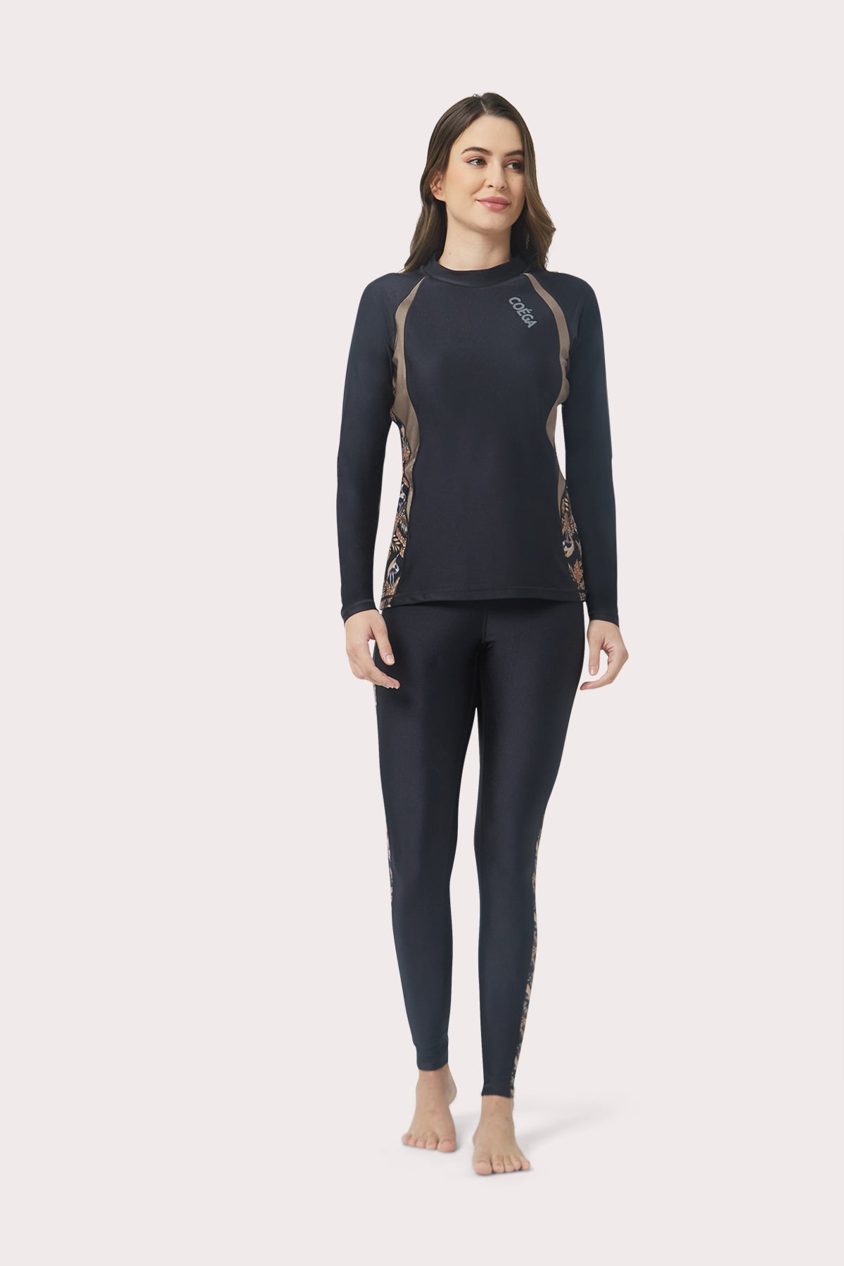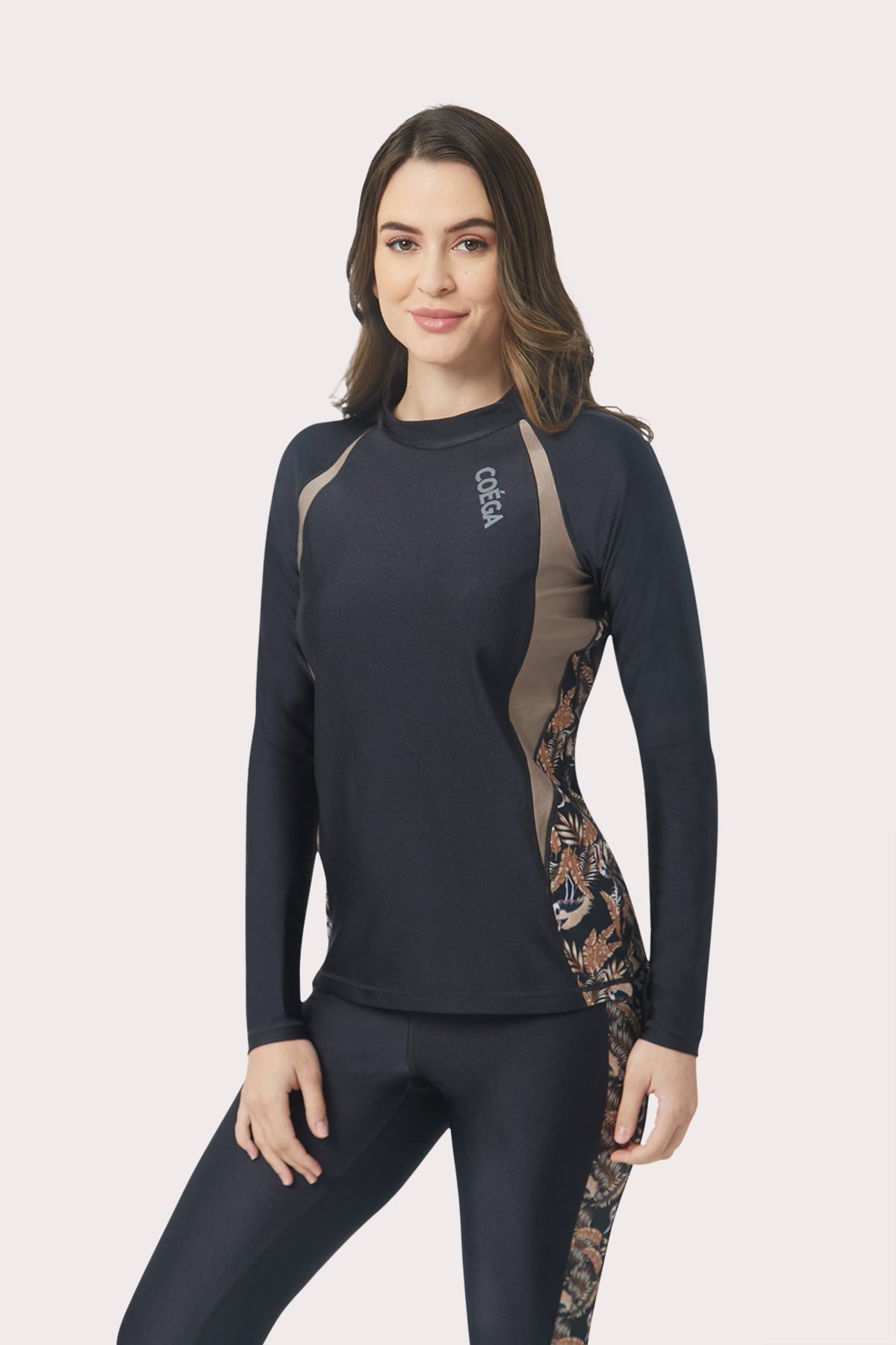 يأتي هذا القميص الواقي من الطفح الجلدي بأكمام طويلة بنمط ألوان جديد تمامًا مع قاعدة سوداء داكنة مع نمط فلامنغو ذهبي جديد تمامًا على طول الجانبين يتألف من درجات اللون الذهبي والبني. هذا القميص الواقي من الطفح الجلدي مصنوع من مواد قابلة للتمدد وناعمة، ويتميز هذا القميص الواقي من الطفح الجلدي بأكمام طويلة بإحساس بشرة ثانية، ولن ترغب أبدًا في خلعه. إلى جانب هذه الراحة التي لا مثيل لها، يتميز هذا القميص الواقي من الطفح الجلدي بأكمام طويلة بحماية مدمجة من الأشعة فوق البنفسجية لضمان بقائك محميًا من الأشعة فوق البنفسجية الضارة أثناء استمتاعك بجميع مغامراتك المائية.