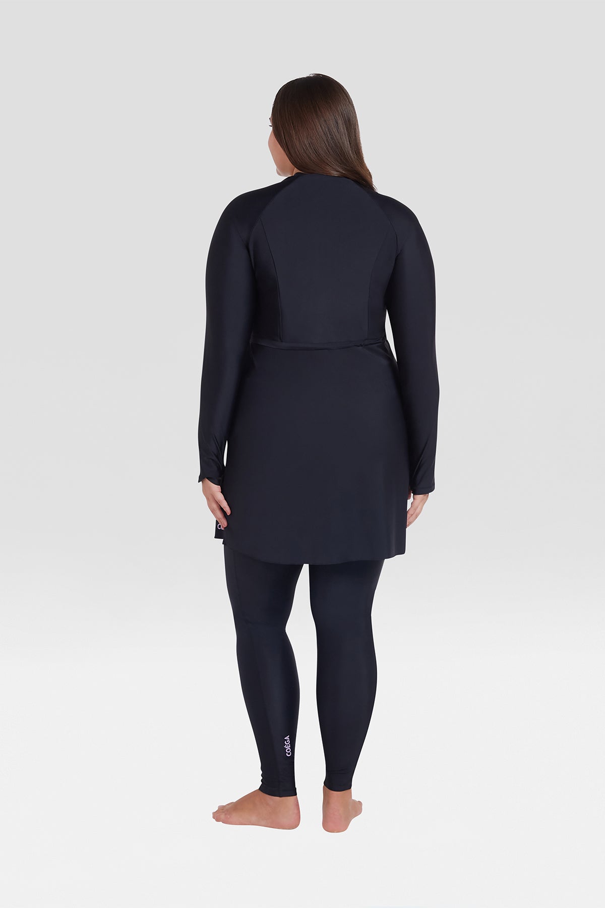 The chic looking the Skirted tunic has lined built-in support with bra padding and is long sleeved with specially designed thumb holes to keep sleeves down and allow freedom to move. Baby snaps on the inside seam secure the tunic to the swim trousers to prevent flare ups.