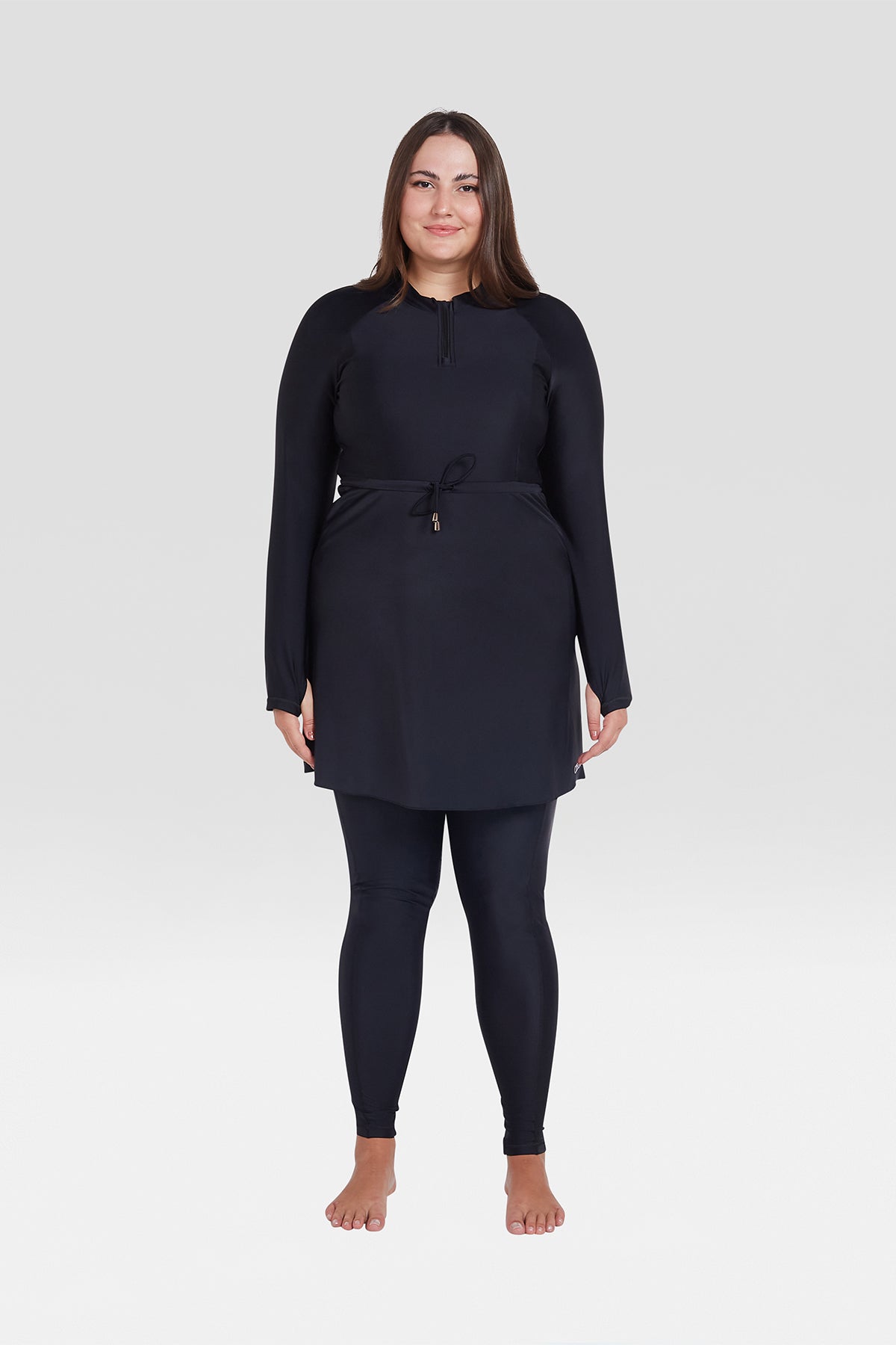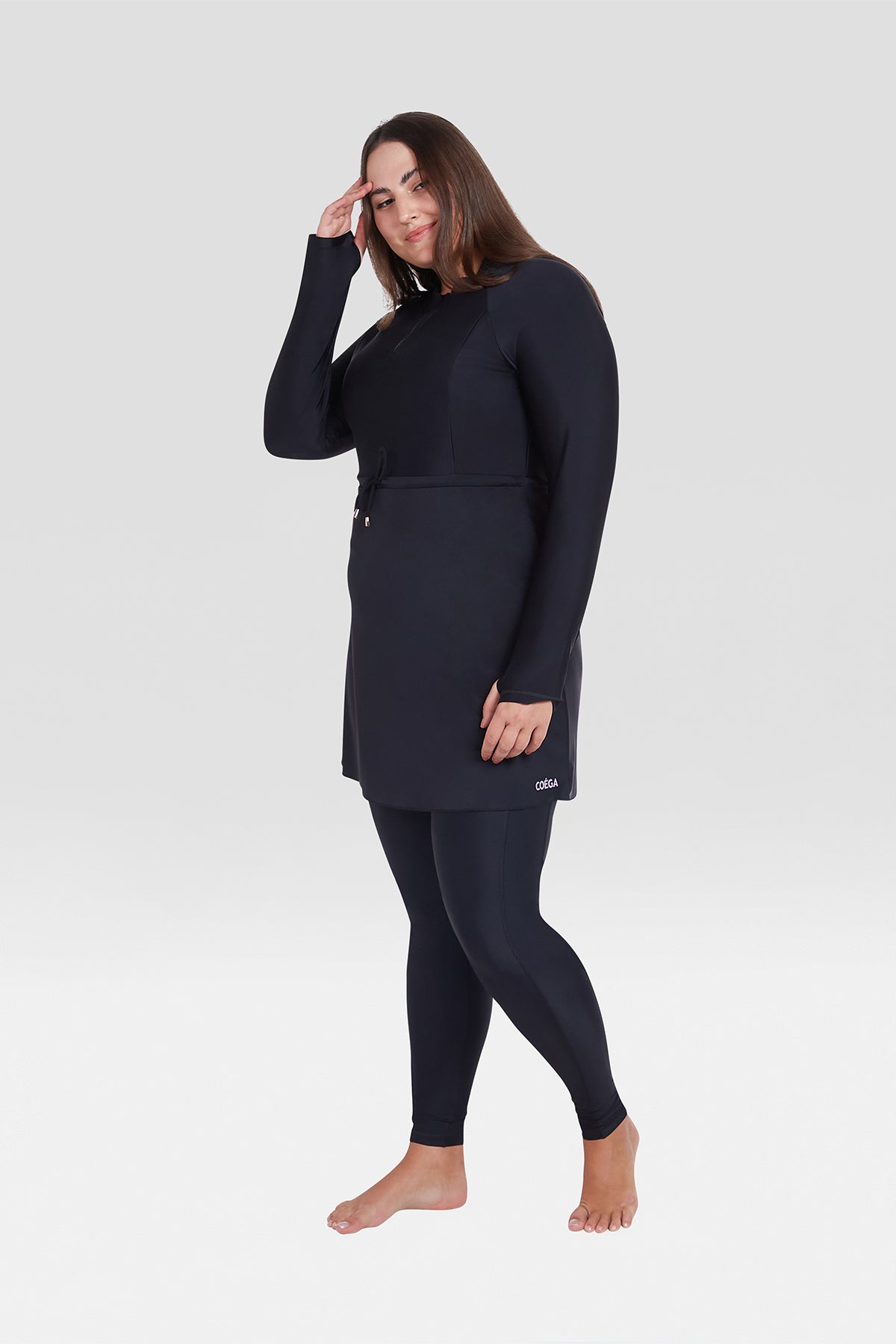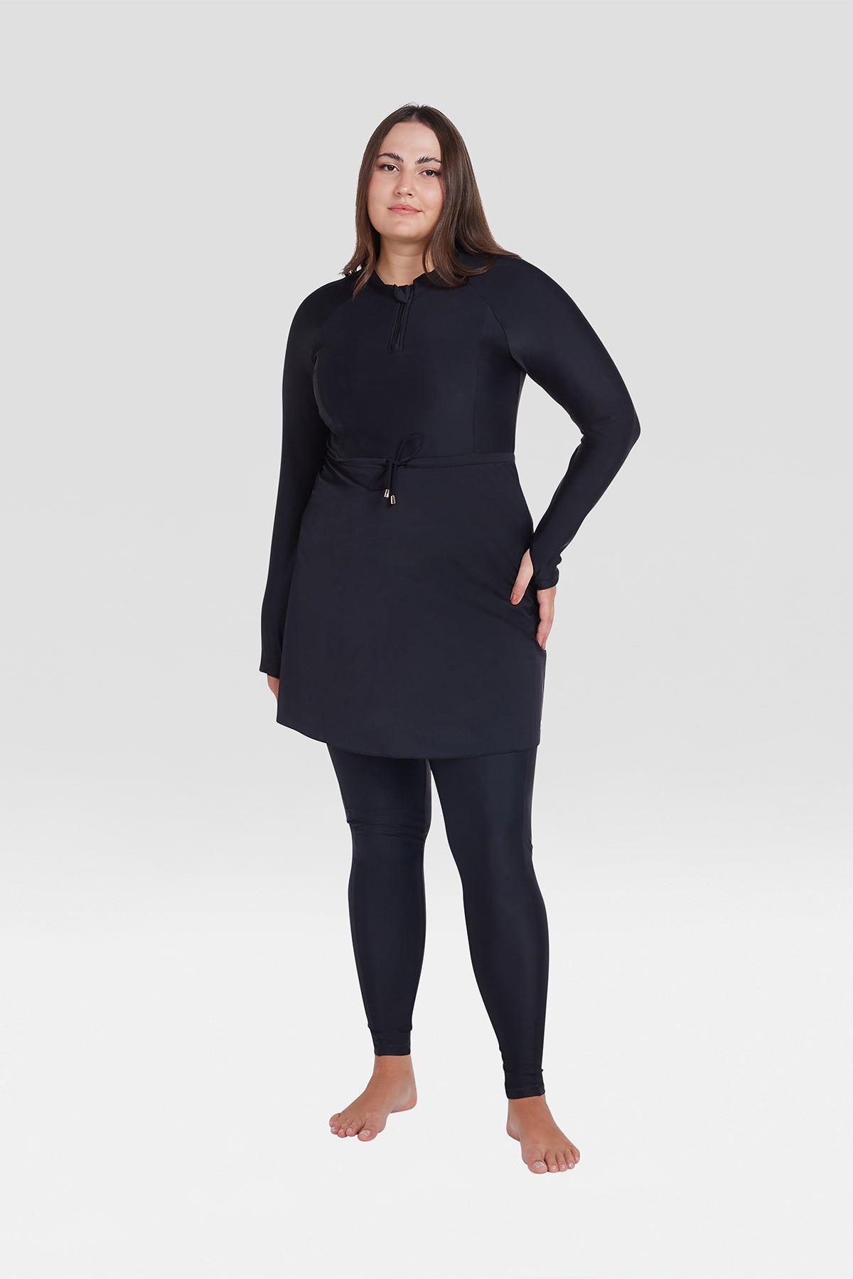Stylish and Chic, this two piece modest swim set has a graceful silhouette and is perfect whether looking for modest or extra sun protection, while enjoying water sports at the beach or pool. One of our newest additions in the Modest swimwear collection made with soft stretch fabric, the outfit includes a mid-length skirted Swim Tunic, and matching full length Swim Trousers.