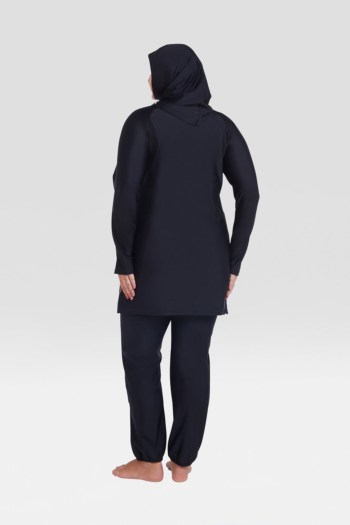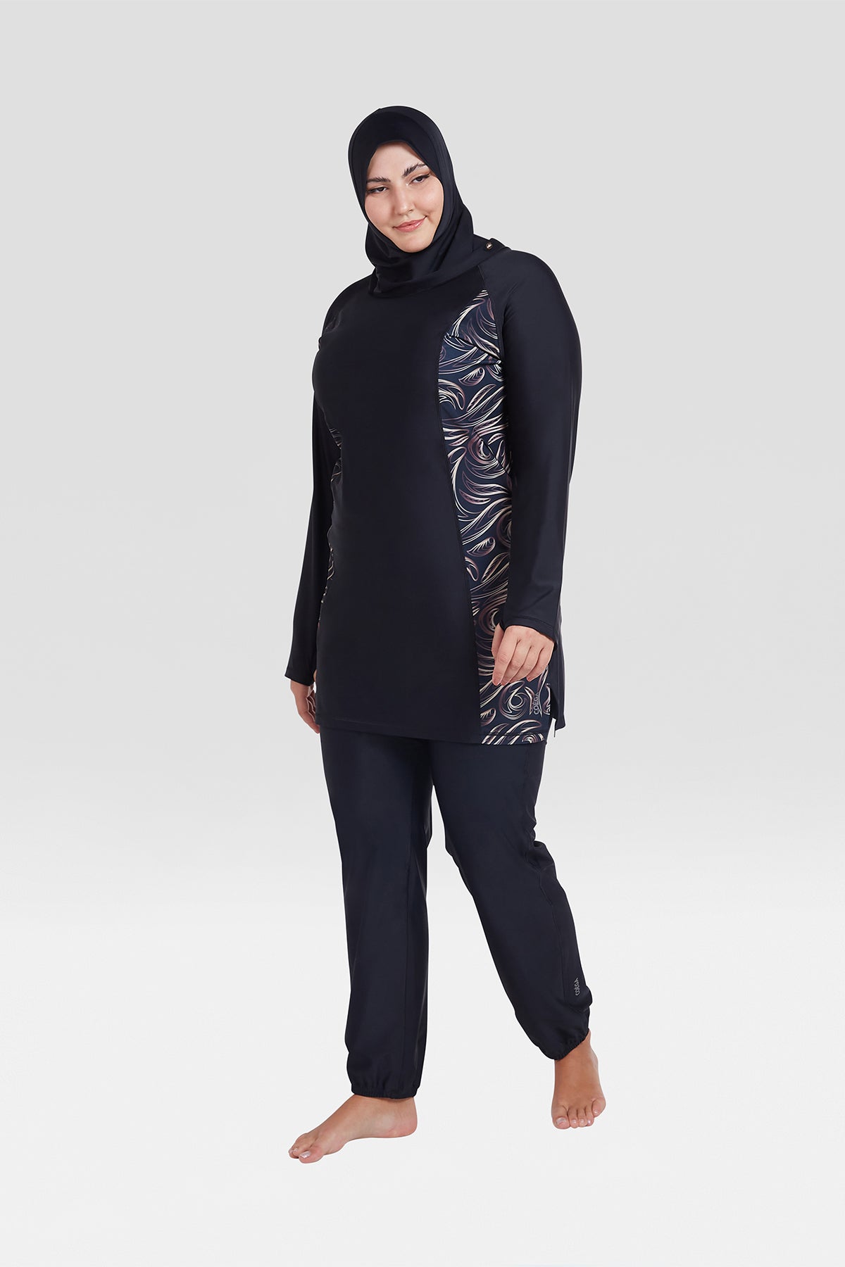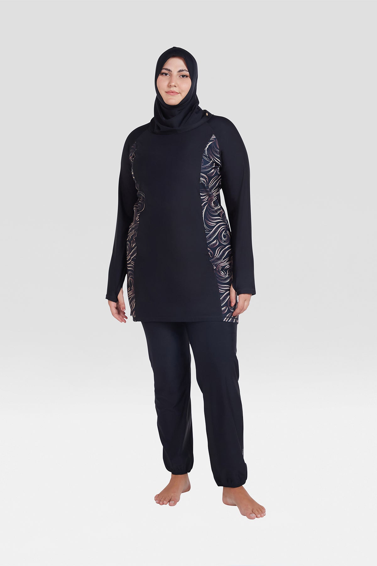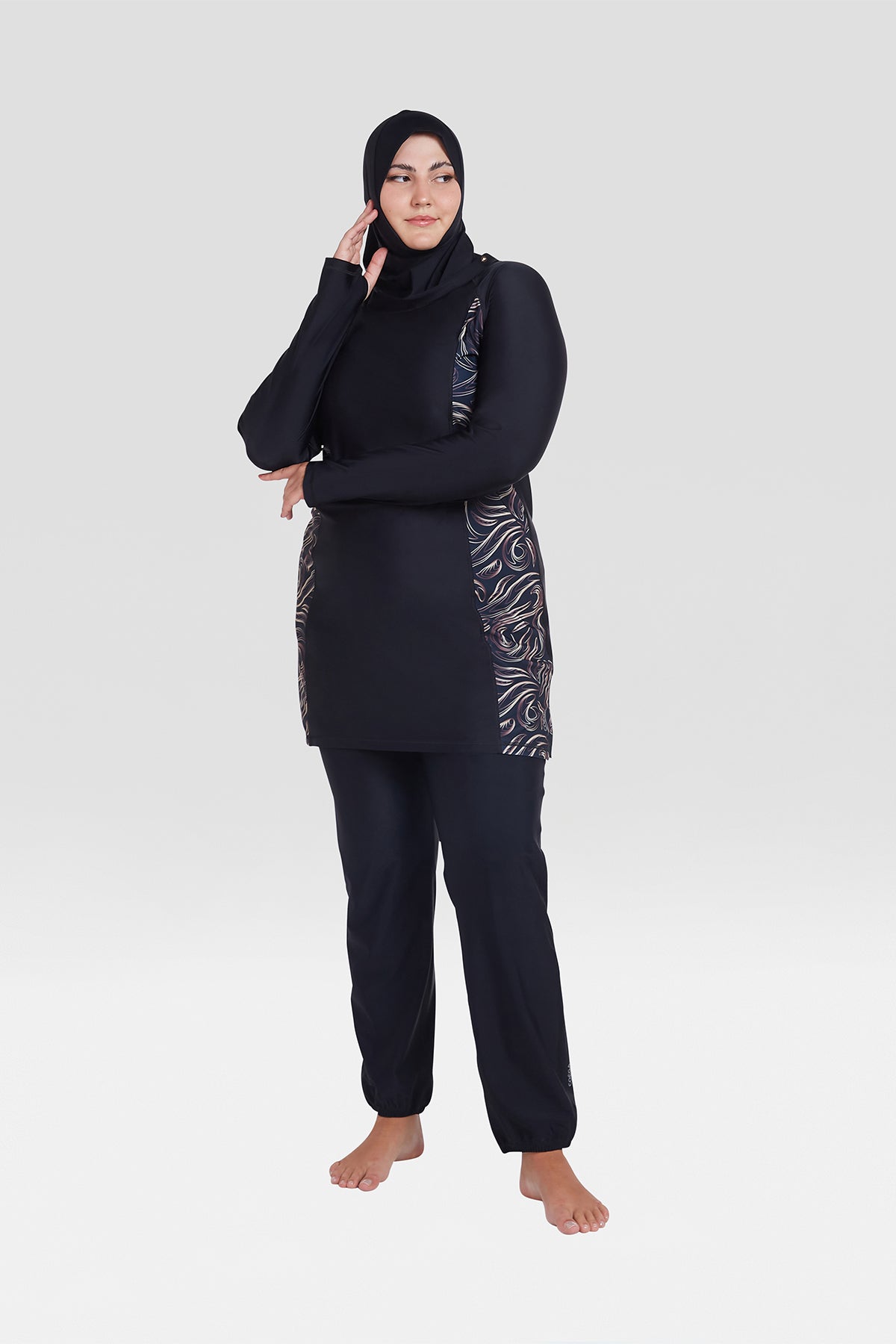 The ultimate modesty set. This unique 3-piece modesty set in all-new Nero Golden Swirls color includes full-length Swim Trousers, Swim Tunic and Shaela. This set has been meticulously crafted by our in-house designers to balance comfort and elegance with premium quality fabric. Ideal for lounging by the poolside or aquatic activities, this versatile set provides a sophisticated and timeless look whilst offering excellent sun protection.