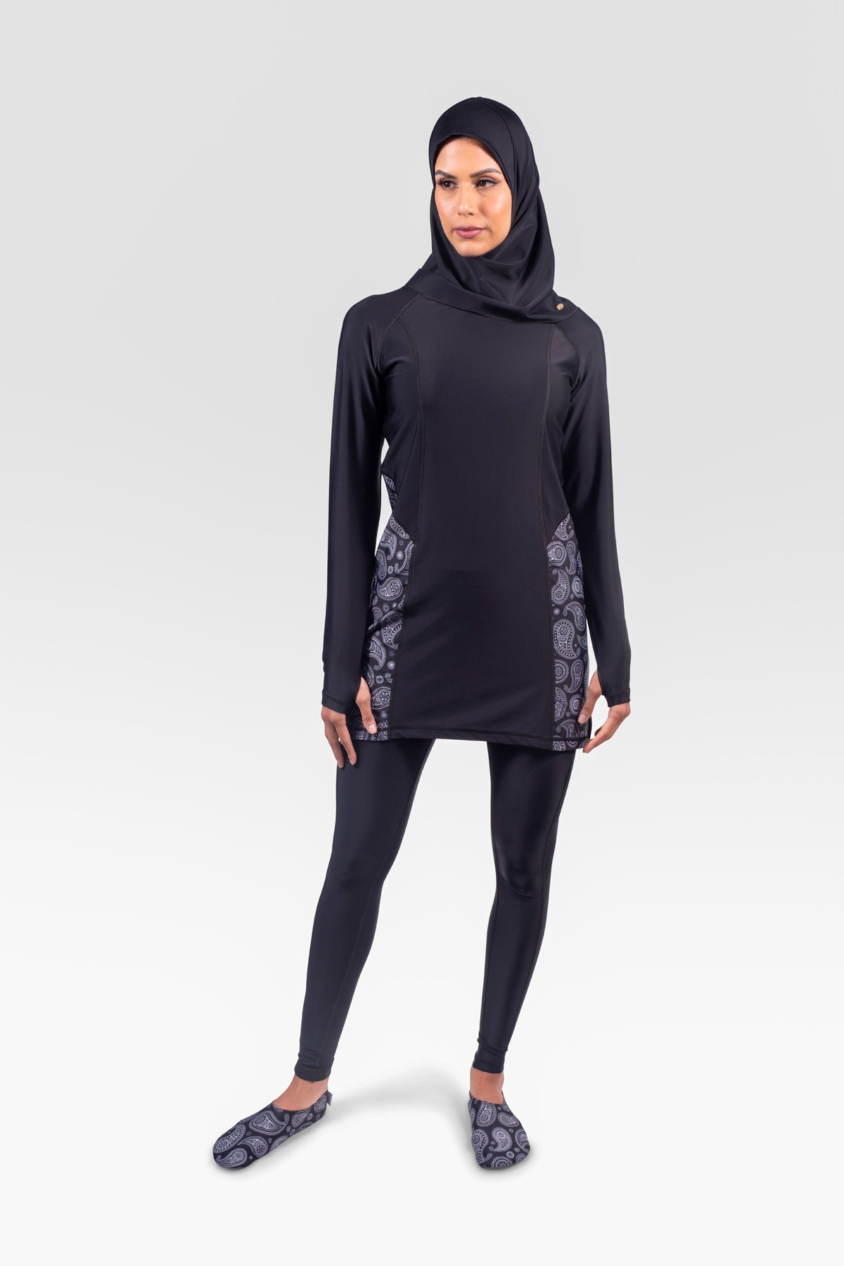 The mid length Swim Tunic has a jet black base with a Nero Paisley pattern on the length of both sides, giving it an elegant pop of colour. The modesty set is comprised of premium quality fabric to ensure the longevity and structural integrity of the Swim Tunic. The Swim Tunic is mid-thigh length with long sleeves that have specially designed thumb holes to secure your preferred coverage, allowing you to move comfortably.