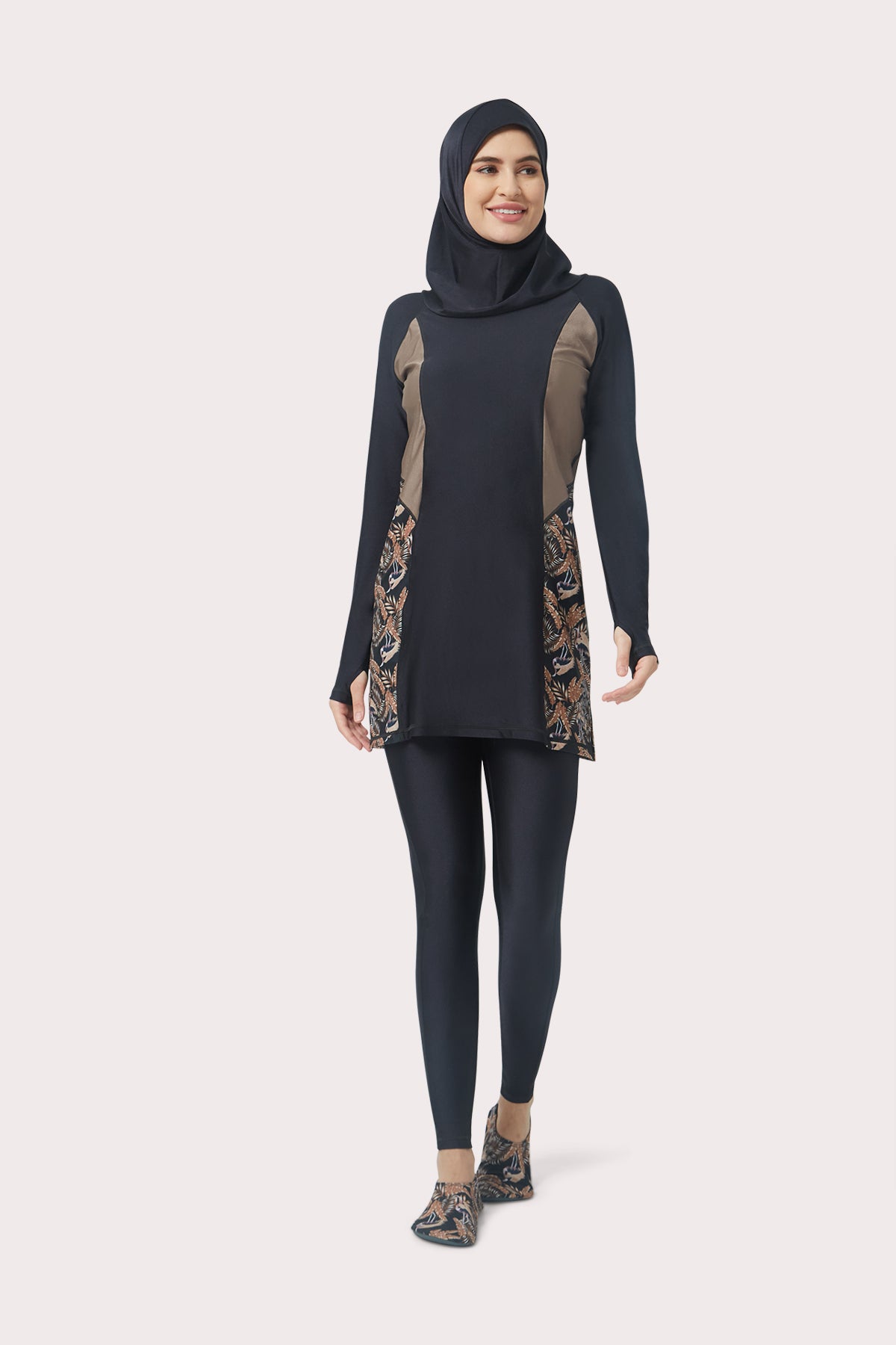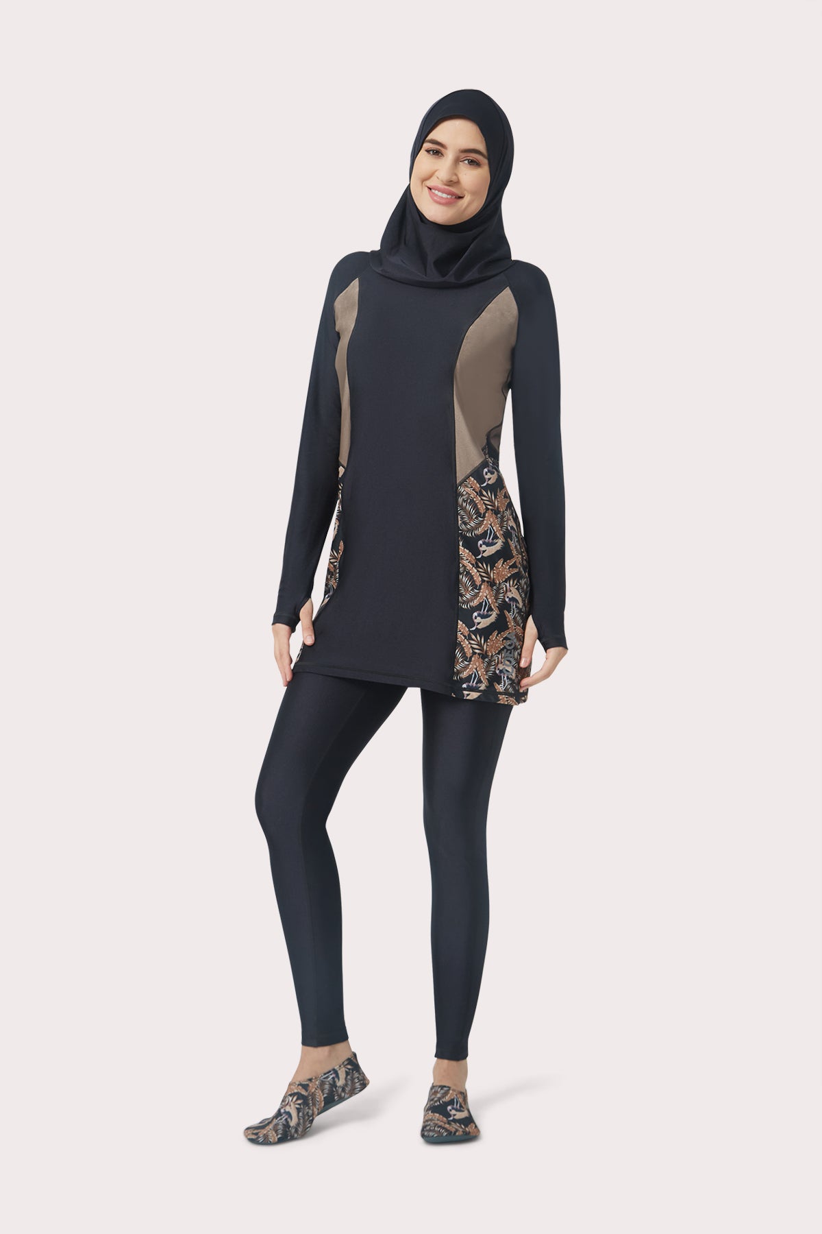 تأتي مجموعة الاحتشام المميزة هذه مع جوارب سباحة طويلة ومتعددة الاستخدامات، مصنوعة من قماش يمنحك أقصى قدر من المرونة والراحة. تتميز جوارب السباحة بملمس ناعم كالزبدة، مع حماية مدمجة من الأشعة فوق البنفسجية لتحميك باستمرار من الأشعة فوق البنفسجية الضارة. ولراحتك، تتميز جوارب السباحة بحزام خصر مرن للتعديل المرن من أجل راحتك. تجف الشيلة في مجموعة الاحتشام هذه بسرعة لتعزيز العملية داخل وخارج الماء. مع شعور أكثر ملاءمة حول الوجه وأكثر ارتخاءً حول الرقبة. يمكن ارتداء هذه الشيلة متعددة الاستخدامات بثلاث طرق مختلفة: تغطية الرأس والرقبة، أو تغطية الرأس وعقدها في الخلف، أو كحجاب تقليدي.
