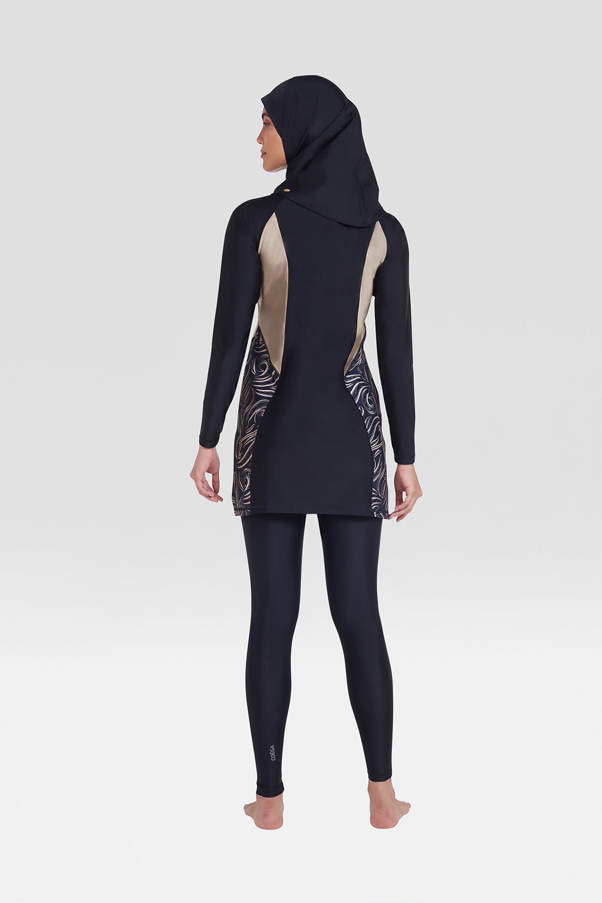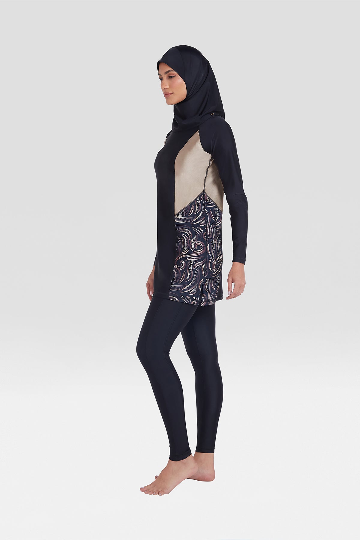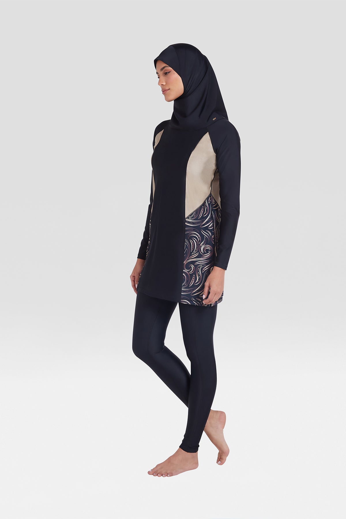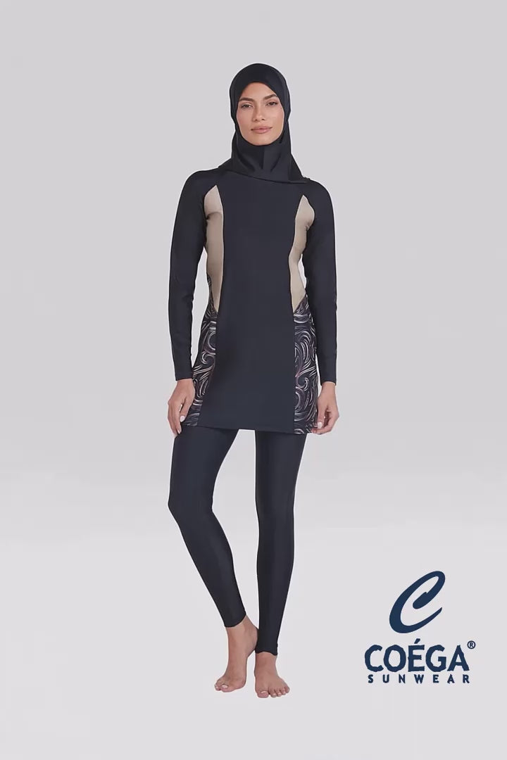 The ultimate modesty set. This unique 3-piece modesty set in all-new Nero Golden Swirl pattern includes full-length Swim Tights, Swim Tunic and Shaela. This set has been meticulously crafted by our in-house designers to balance comfort and elegance with premium quality fabric. Ideal for lounging by the poolside or aquatic activities, this versatile set provides a sophisticated and timeless look whilst offering excellent sun protection.