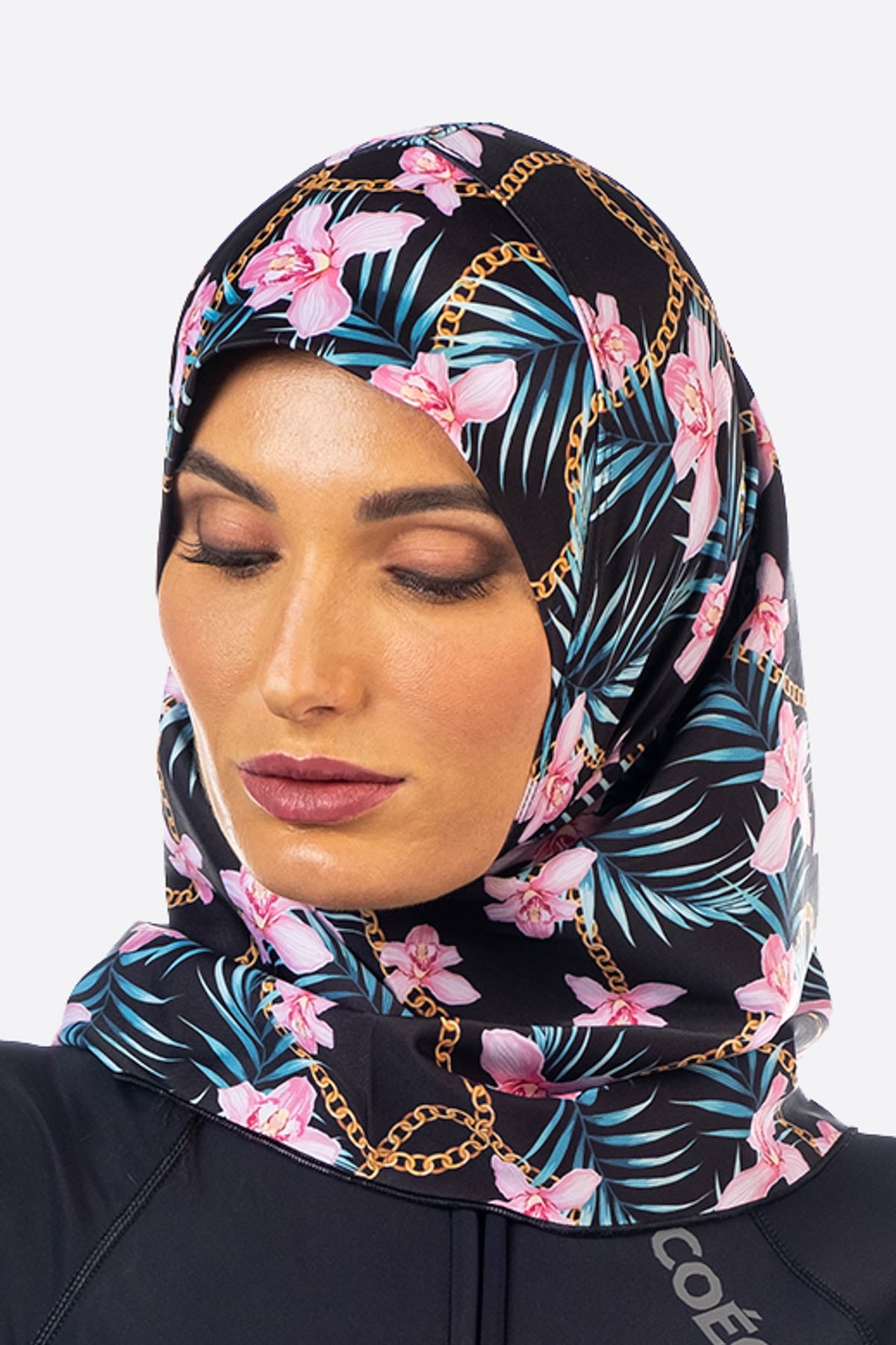 This unique design is well fitted around the face and looser through the neck. Can be worn in three different ways: covering the head and neck, covering the head and knotted at the back, or as a traditional hijab. Perfect for all your beach or pool activities.