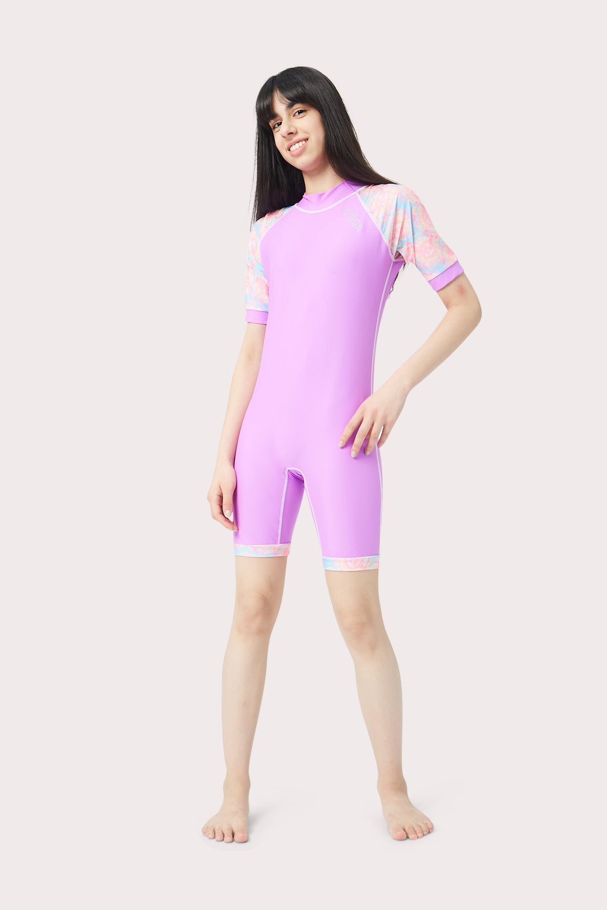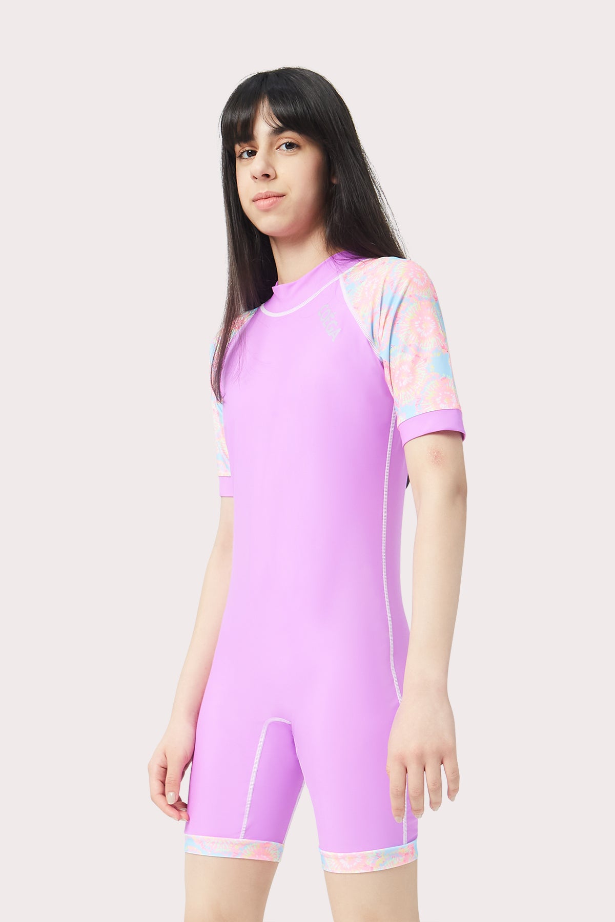 The popular COÉGA Girls One Piece Suit is now in an all-new Pink Blue Tie Dye design. The suit is a muted purple with the Pink Blue Tie Dye pattern on the sleeves and at the bottom of the suit, adding a subtly pop of pattern, allowing the suit to be both timeless and fun. The girls One-Piece suit is designed with ¾ length zip for quick and easy access for your active little one.