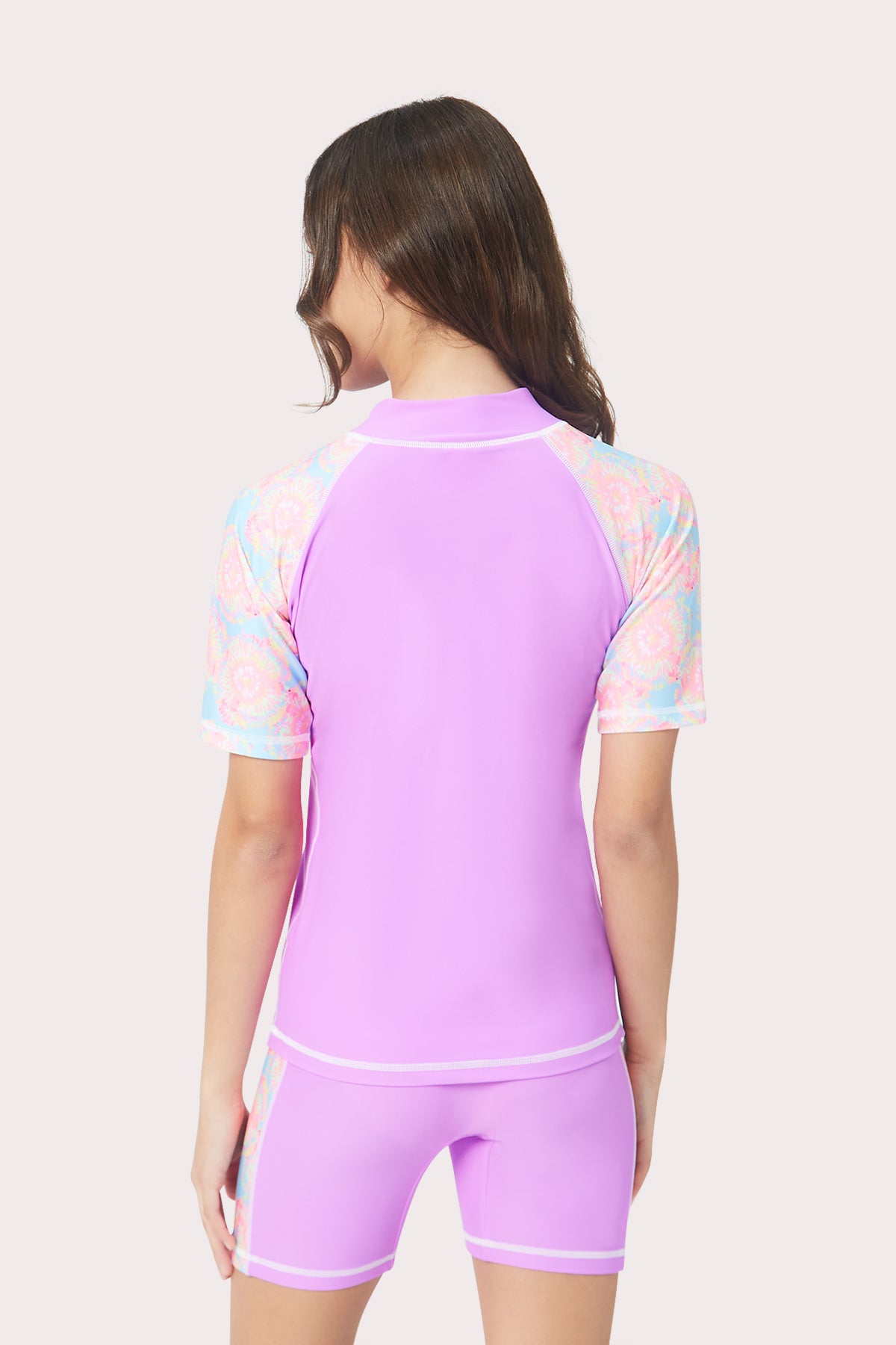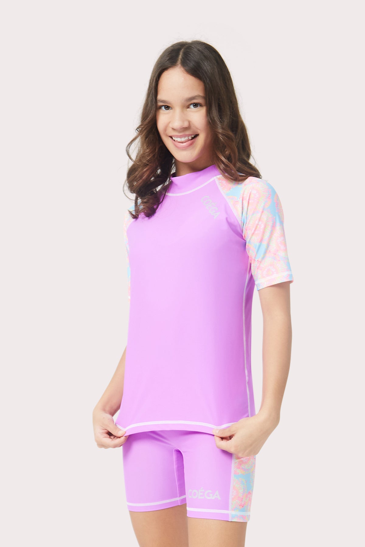 Your daughters favorite Two Piece Suit in an all-new pattern. A matching Two Piece Set with Swim Shorts and Rashguard that are going to be your daughters new favorite swimwear. With an all-new Pink Blue Tie Dye design, the short sleeve Rashguard and shorts are a muted purple, with Pink Blue Tie Dye patterns on the sleeves of the Rashguard, and Pink Blue Tie Dye pattern on the side of the shorts.