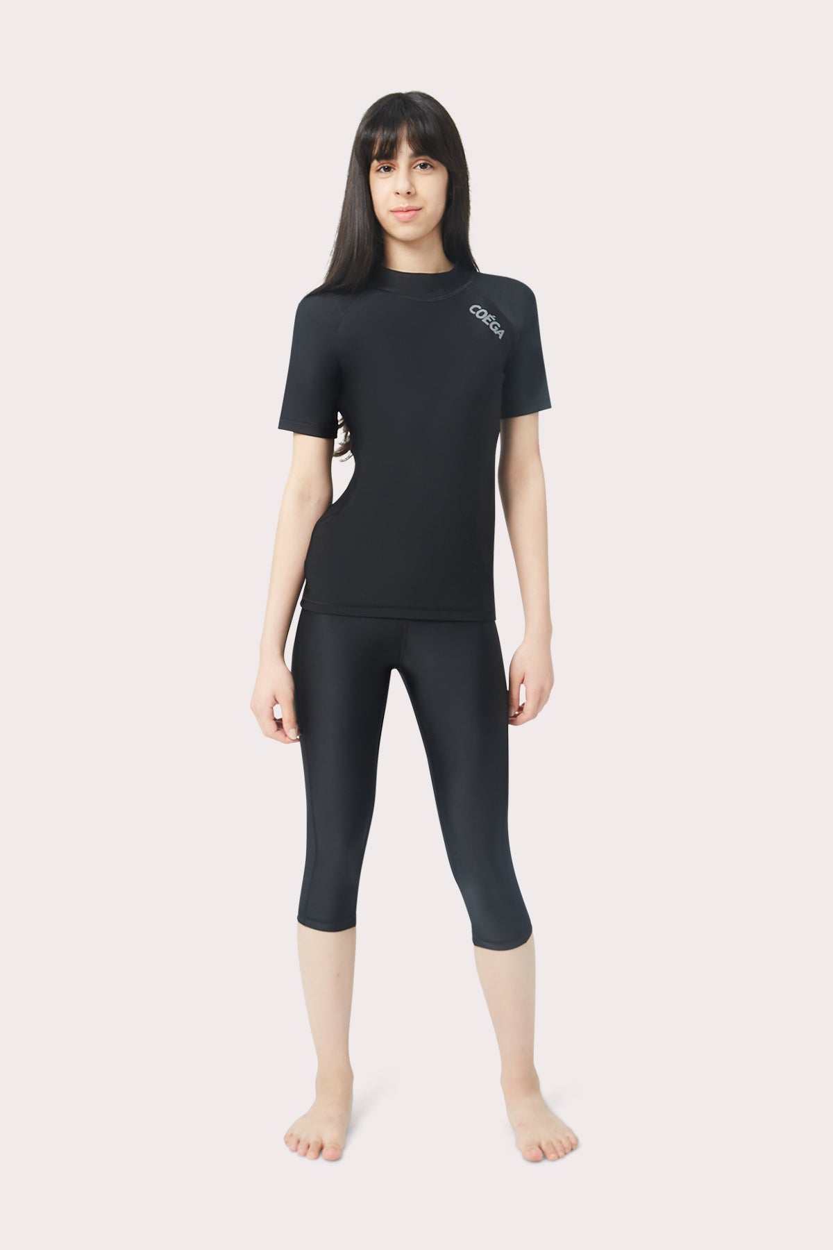 Stretchable and soft, these snug 3/4th length tights come with a wider waistband and insert down the outside of the leg to give the perfect fit. Can be paired with matching COEGA Girls Rash Guards or Swim Tops for a variety of stylish looks.