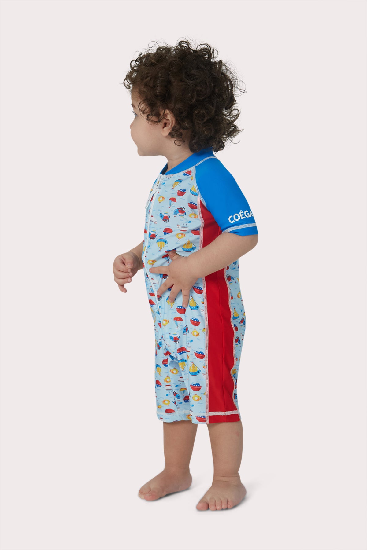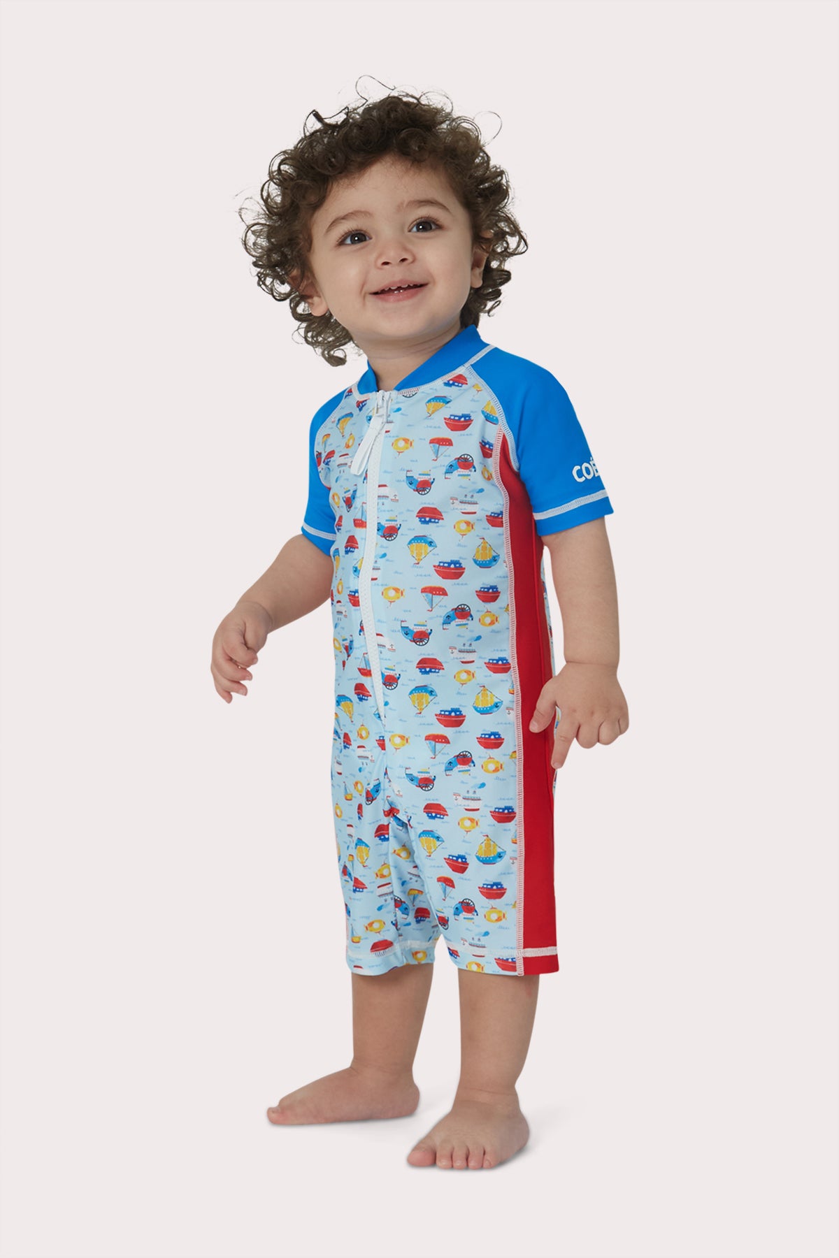 The popular COÉGA baby boys one piece suit is designed with a ¾ length front zip for quick and easy access for your active little one. The featherlike lightweight and breathable fabric also provides comfort and freedom of movement during active water play to ensure maximum comfortability for your little one. The fabric being comprised of UV protective material as well as being chlorine and saltwater resistant fuses comfortability and protection all in one. Ensuring the longevity of your child's favorite swimwear.