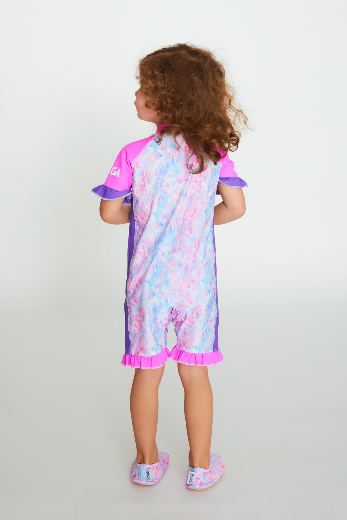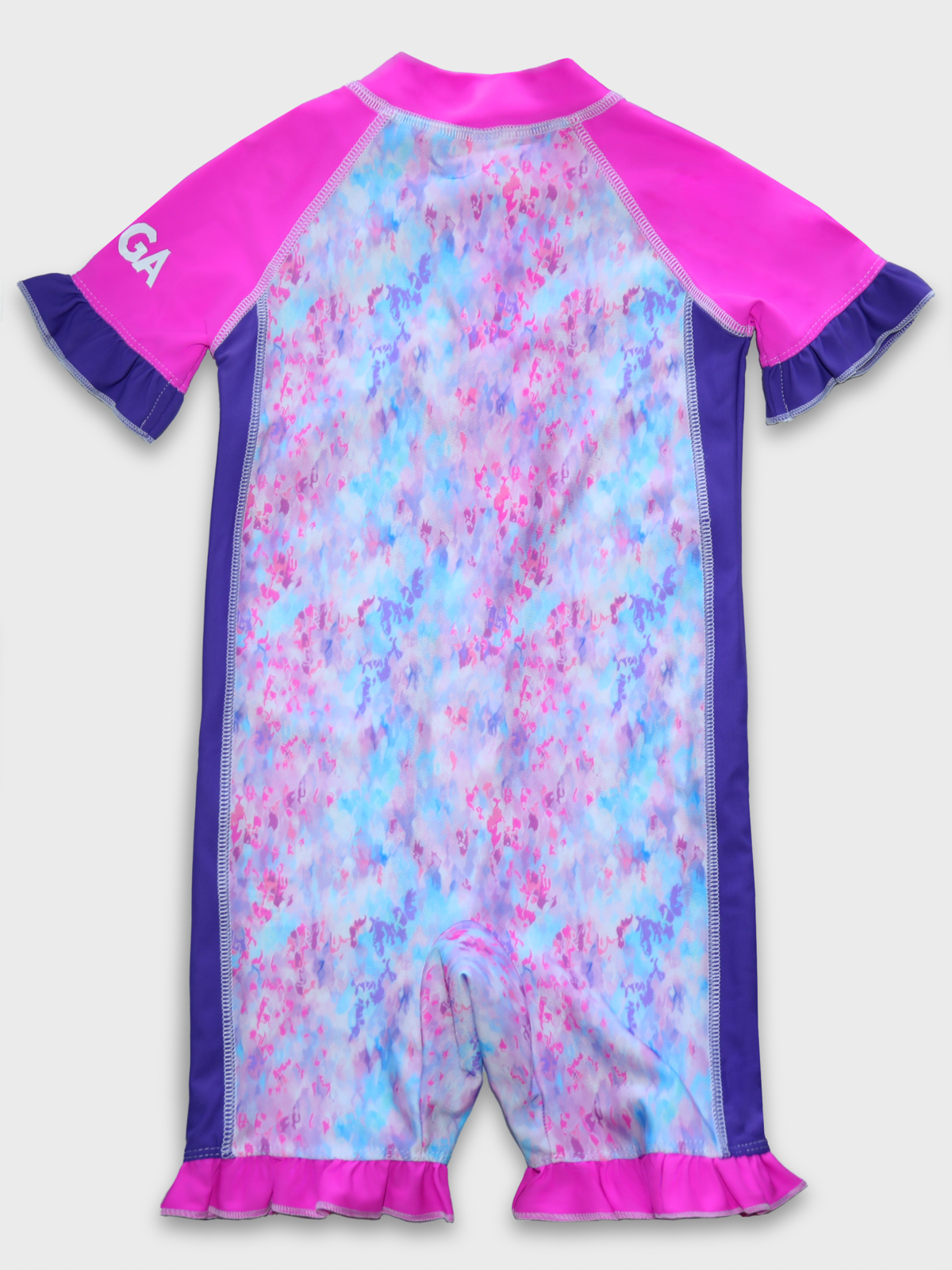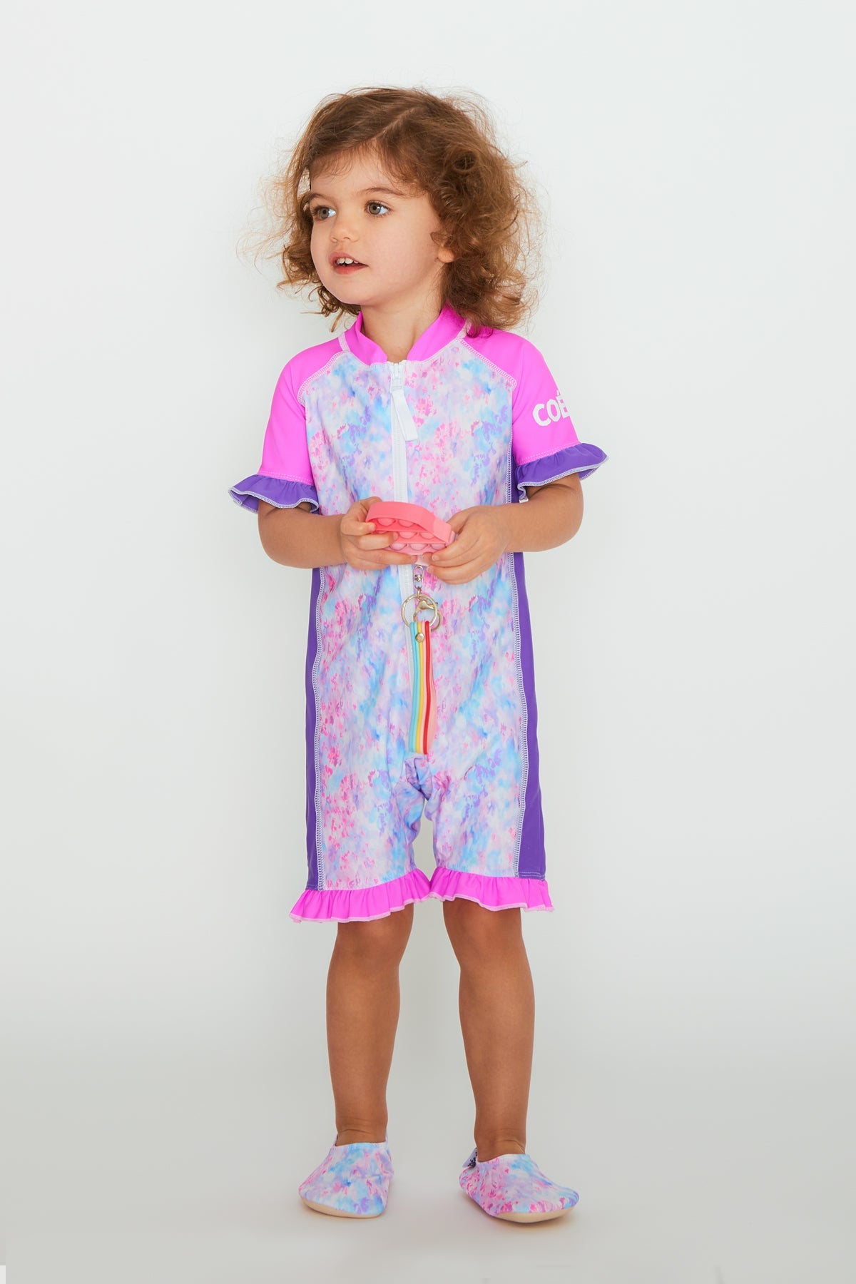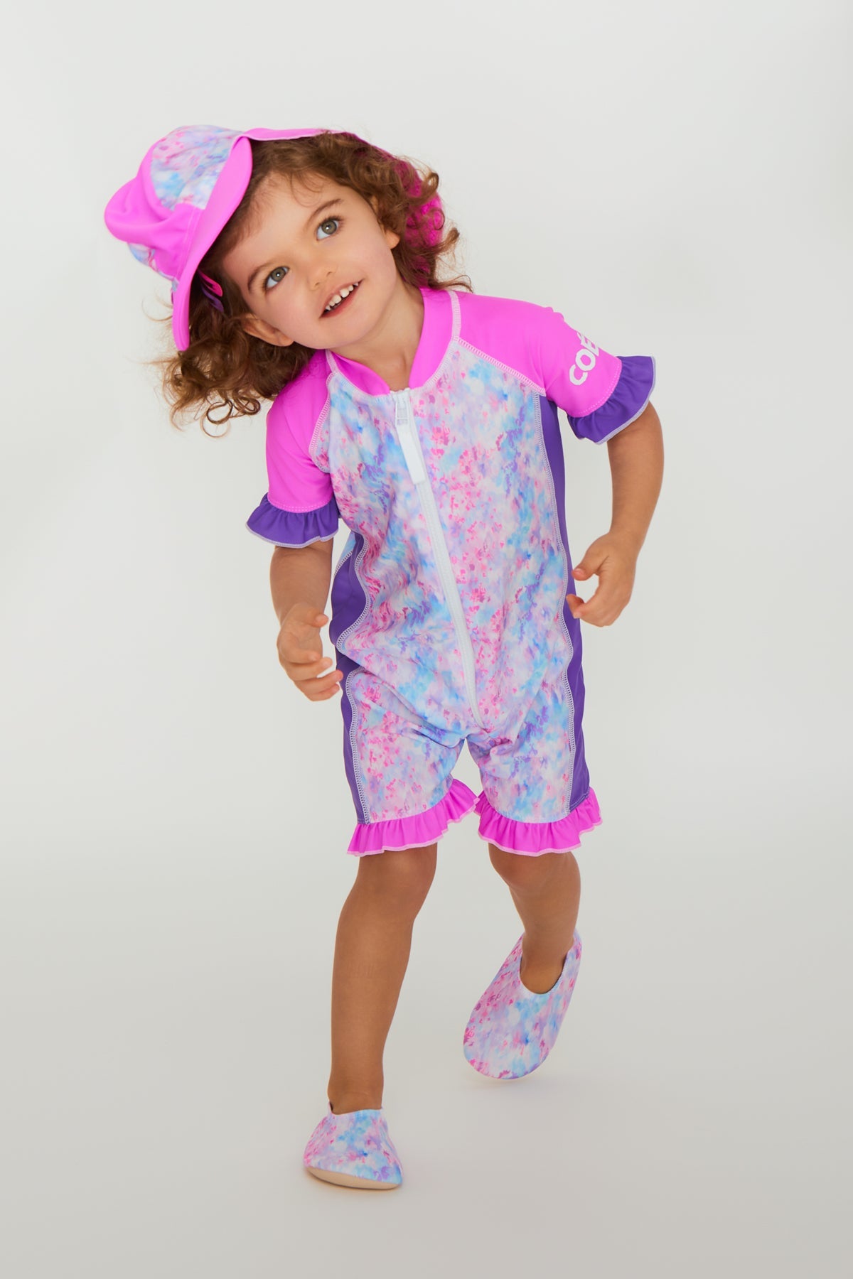 The popular COEGA baby girls one piece suit is designed with ¾ length front zip for quick and easy access for your active little one. Our lightweight and breathable fabric also provides comfort and freedom of movement during active water play. The pretty frills adds a playful touch to the suit. The chlorine and saltwater resistant fabric retains its shape and dries quickly all while providing much needed protection, so your little beach dude or mermaid can Go Ahead and Love the Sun!
