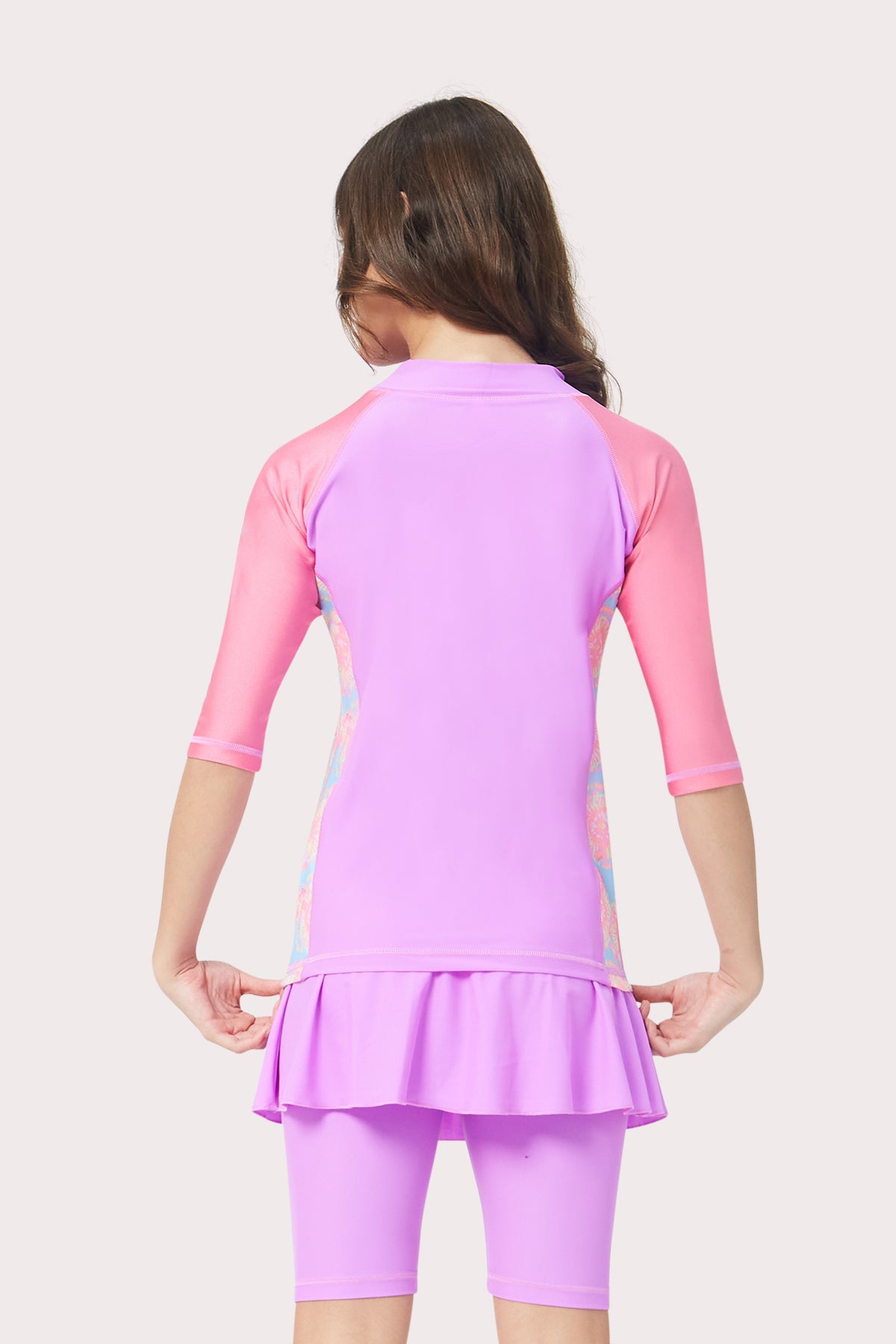 This unique and comfortable two-piece design is perfect whether looking for modesty or extra sun protection, while enjoying water sports at the beach or pool. Made with soft stretch fabric, the outfit includes a 3/4th sleeve rash guard and matching skirted swim shorts. Longer in length, the rash guard in the body provides extra comfort and coverage to keep you UV protected whether playing or learning to swim. The skirted shorts are swim shorts with a cover up built into one piece. Go Ahead, Love the Sun!