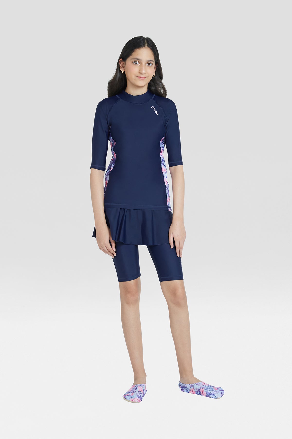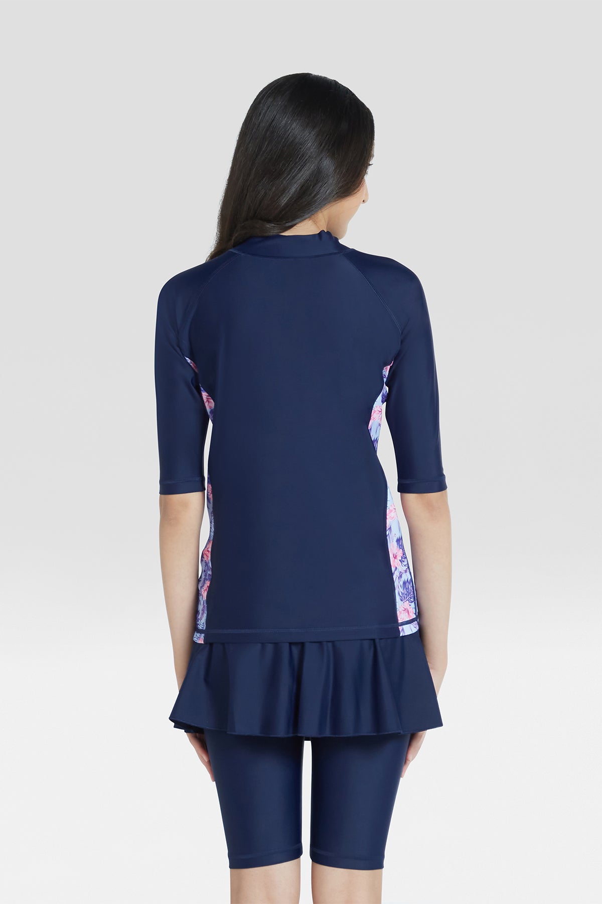 Longer in length, the rash guard in the body provides extra comfort and coverage to keep you UV protected whether playing or learning to swim. The skirted shorts are swim shorts with a cover up built into one piece. Go Ahead, Love the Sun!