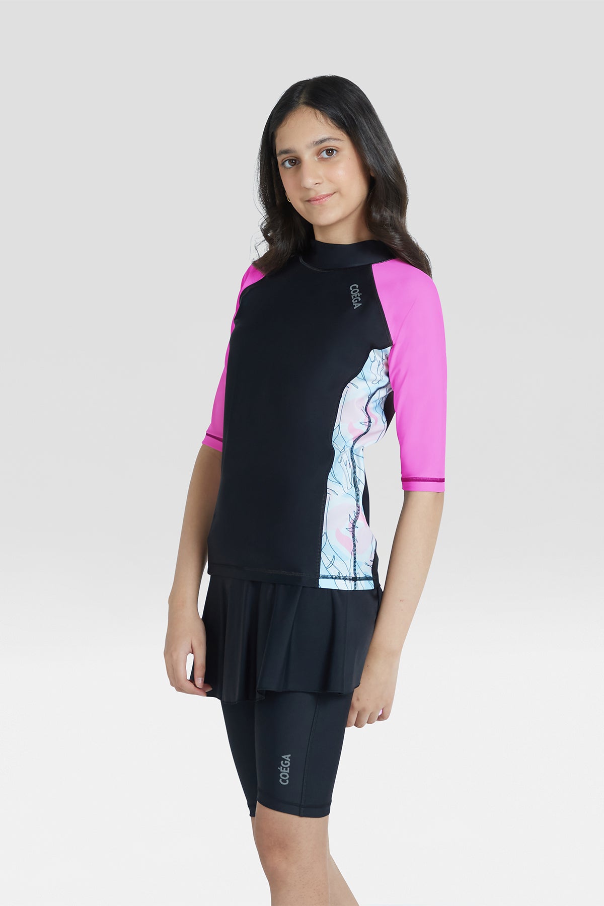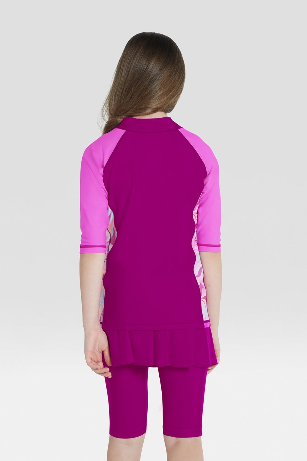 Longer in length, the rash guard in the body provides extra comfort and coverage to keep you UV protected whether playing or learning to swim. The skirted shorts are swim shorts with a cover up built into one piece. Go Ahead, Love the Sun!