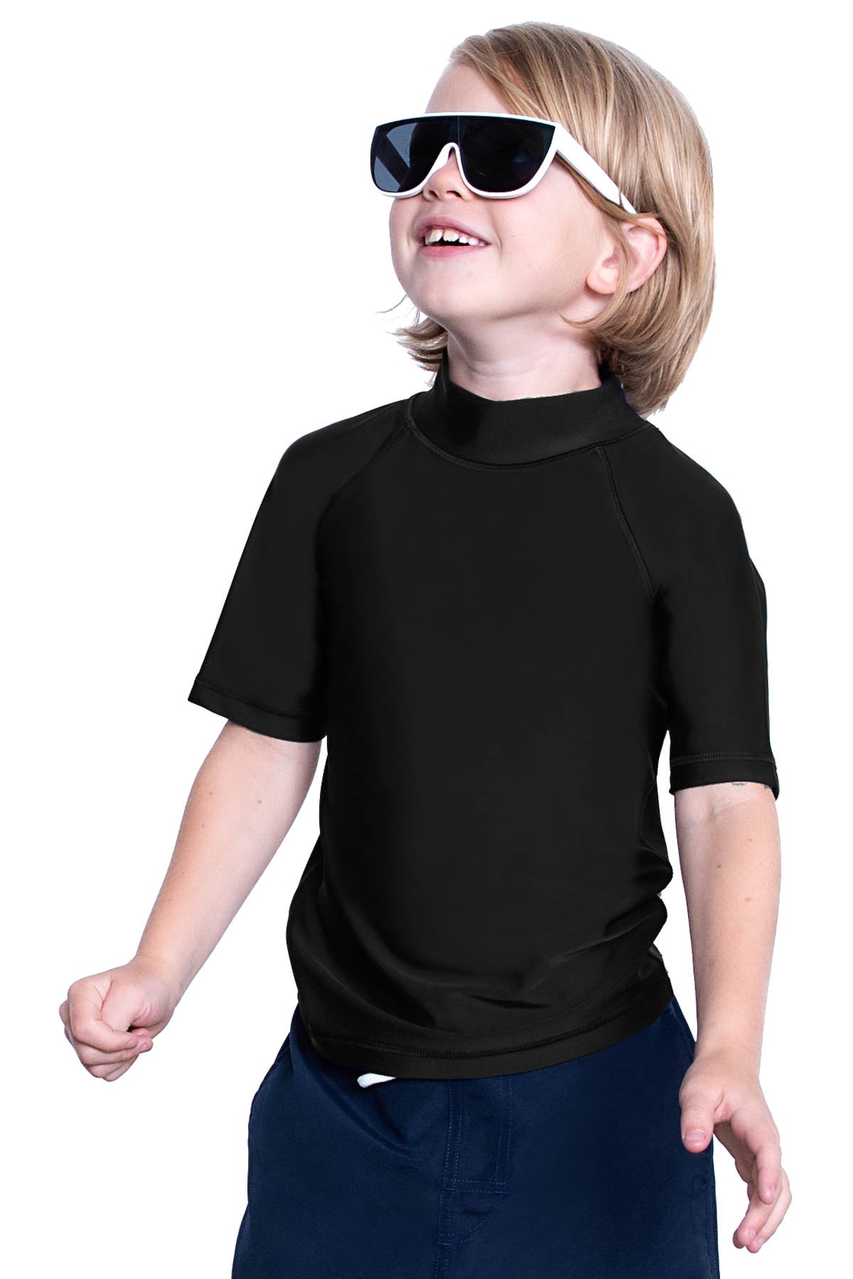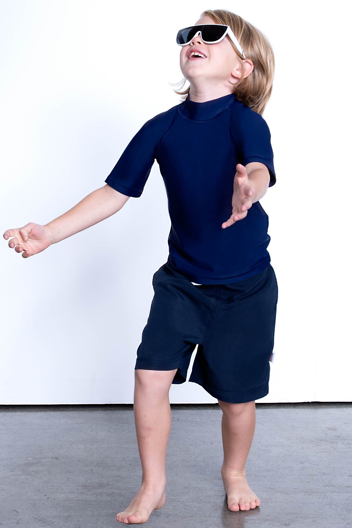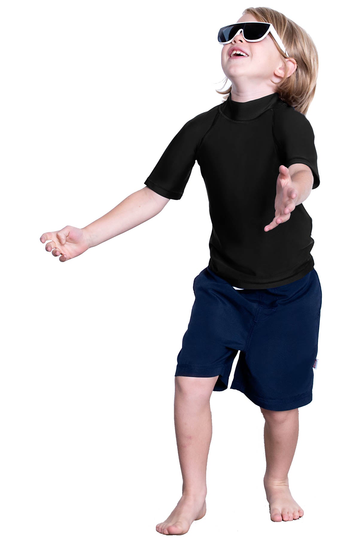 Stretchable and soft, this short sleeved rash guard will provide your child with protection from the sun while enjoying the beach or pool. Longer in length in the body provides extra comfort and coverage to keep them UV protected whether they are playing or learning to swim. Raglan style short sleeves extend to just above the elbow and minimize bulk under the arms. Go Ahead, Love the Sun!