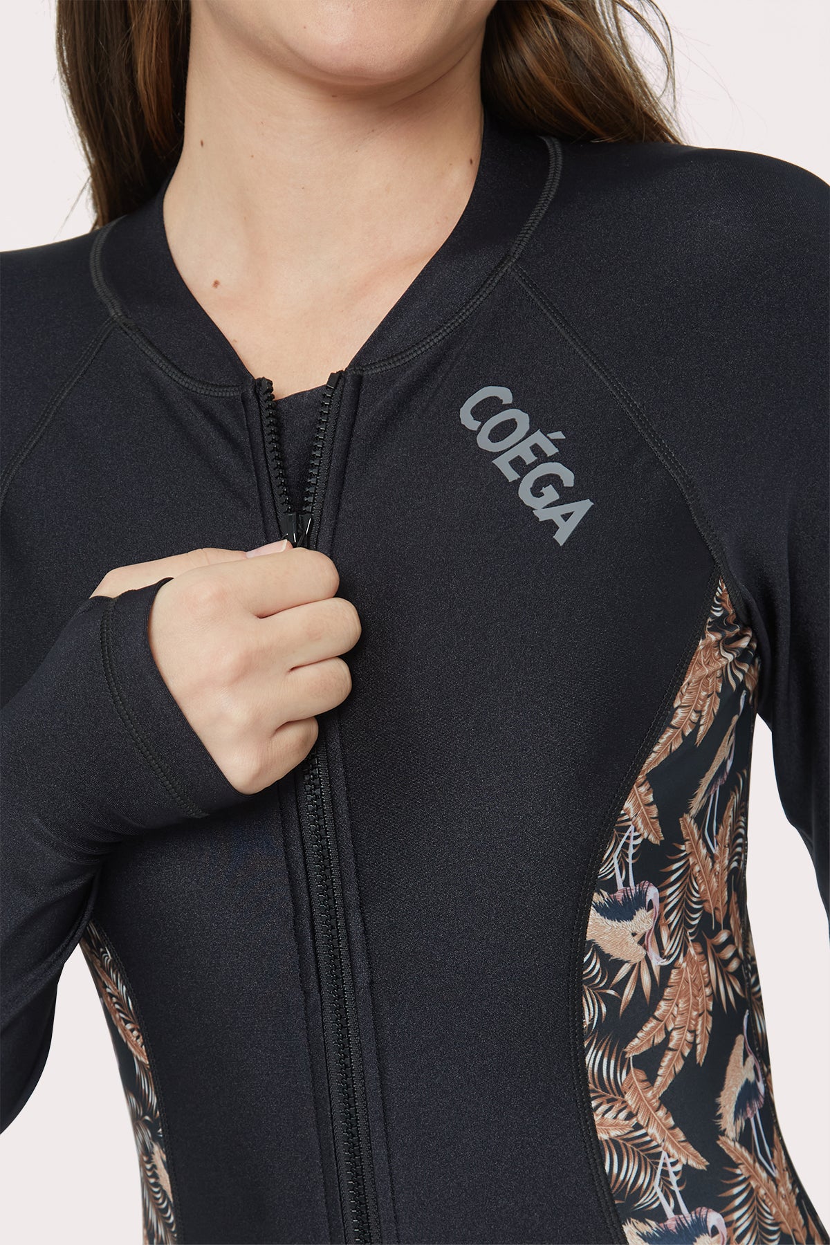 Turn heads and make waves in this sporty One Piece Long-Sleeve Surf Suit in an all-new Nero Golden Flamingo pattern. The Surf Suit comes in black with the Nero Golden Flamingo pattern on the side panels, giving the swimsuit a subtle pop of color that radiates elegance. The Surf Suit has a high neck design with a front zipper for easy maneuver in and out of the suit.