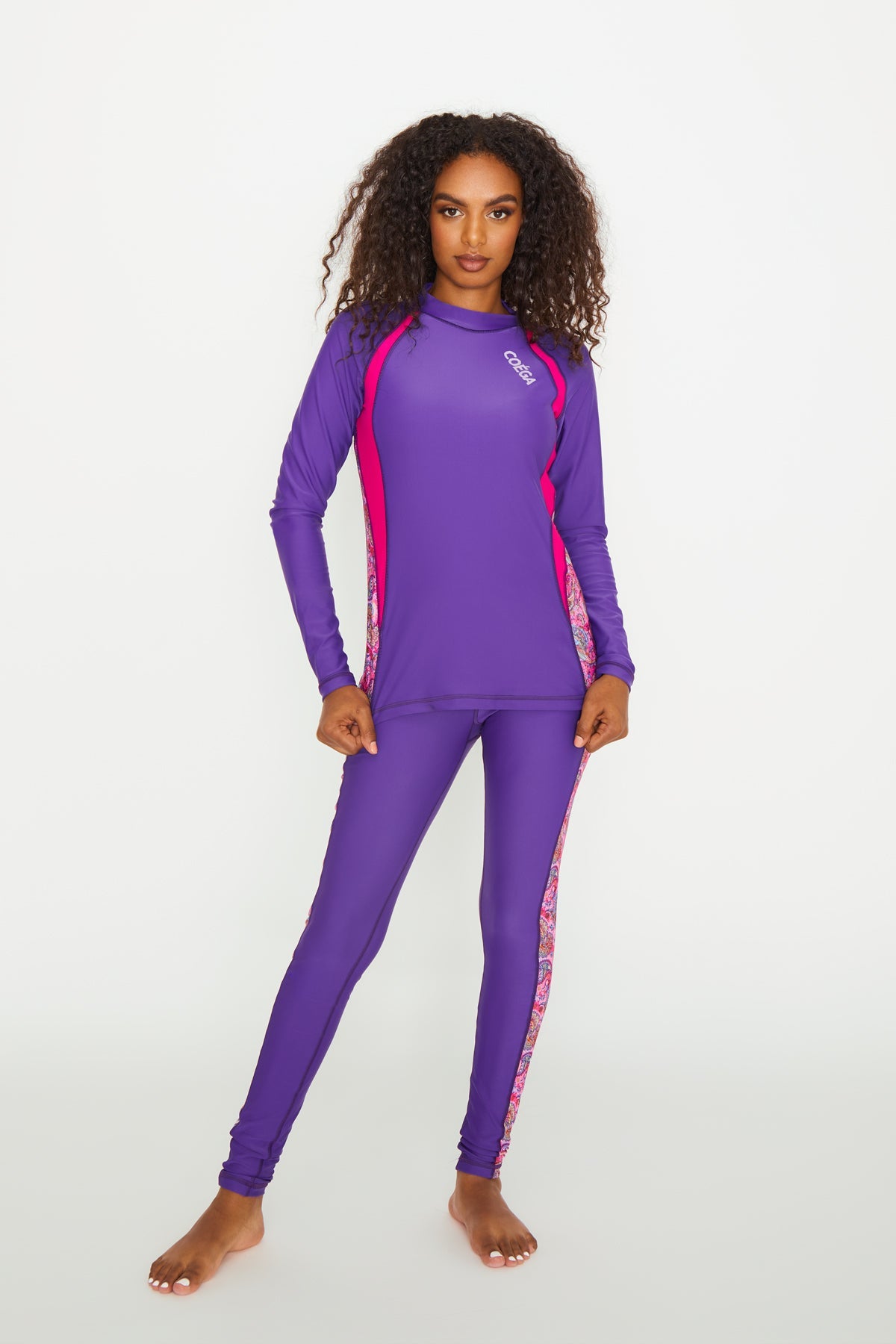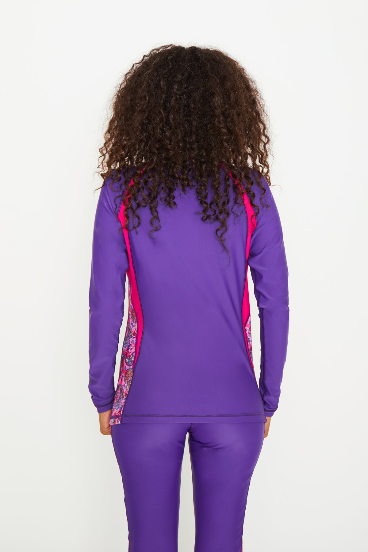 Stretchable and soft, this long sleeved rash guard will provide you with protection from the sun while enjoying the beach or pool. Longer body length and long raglan sleeves provides extra comfort and coverage in the sun.