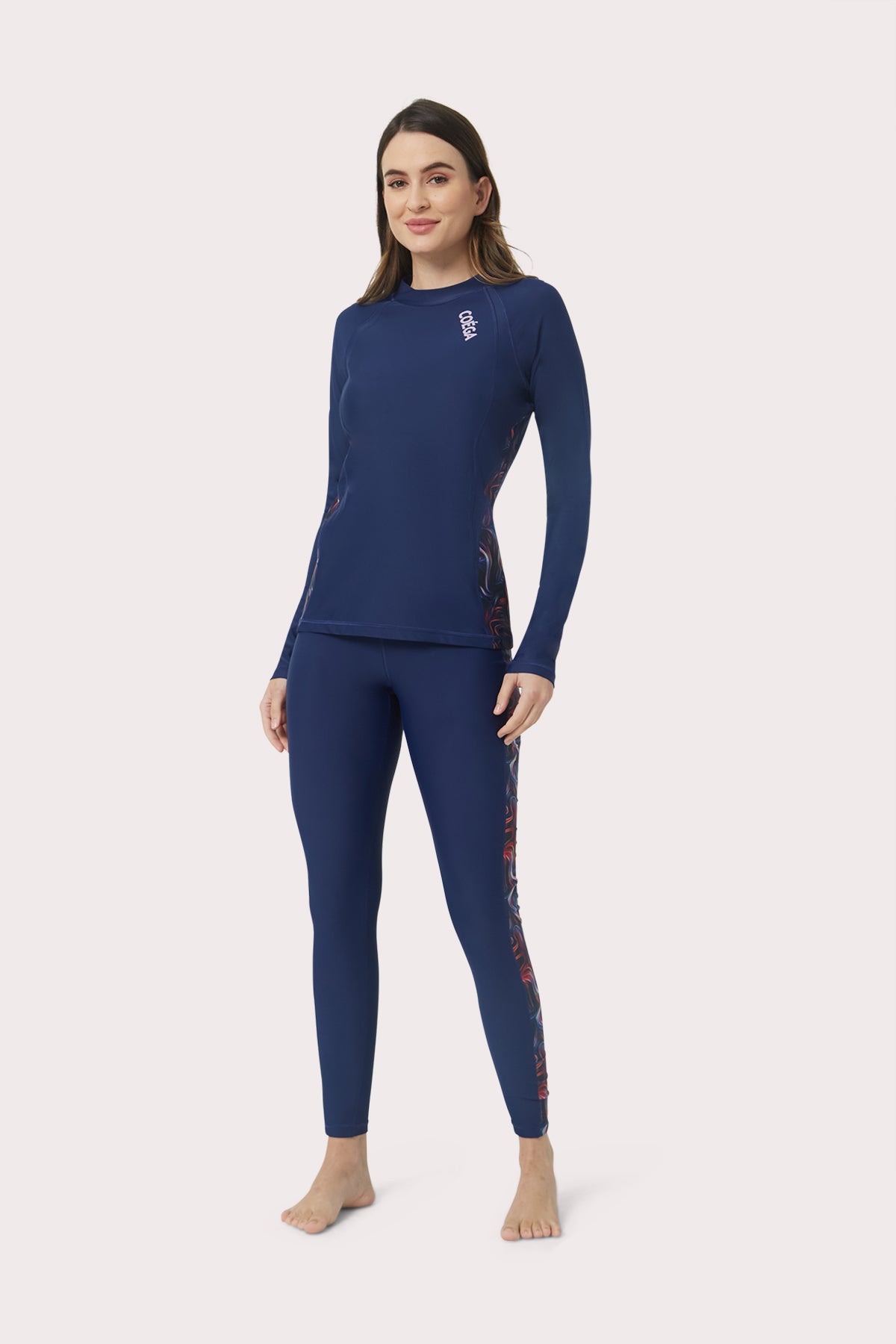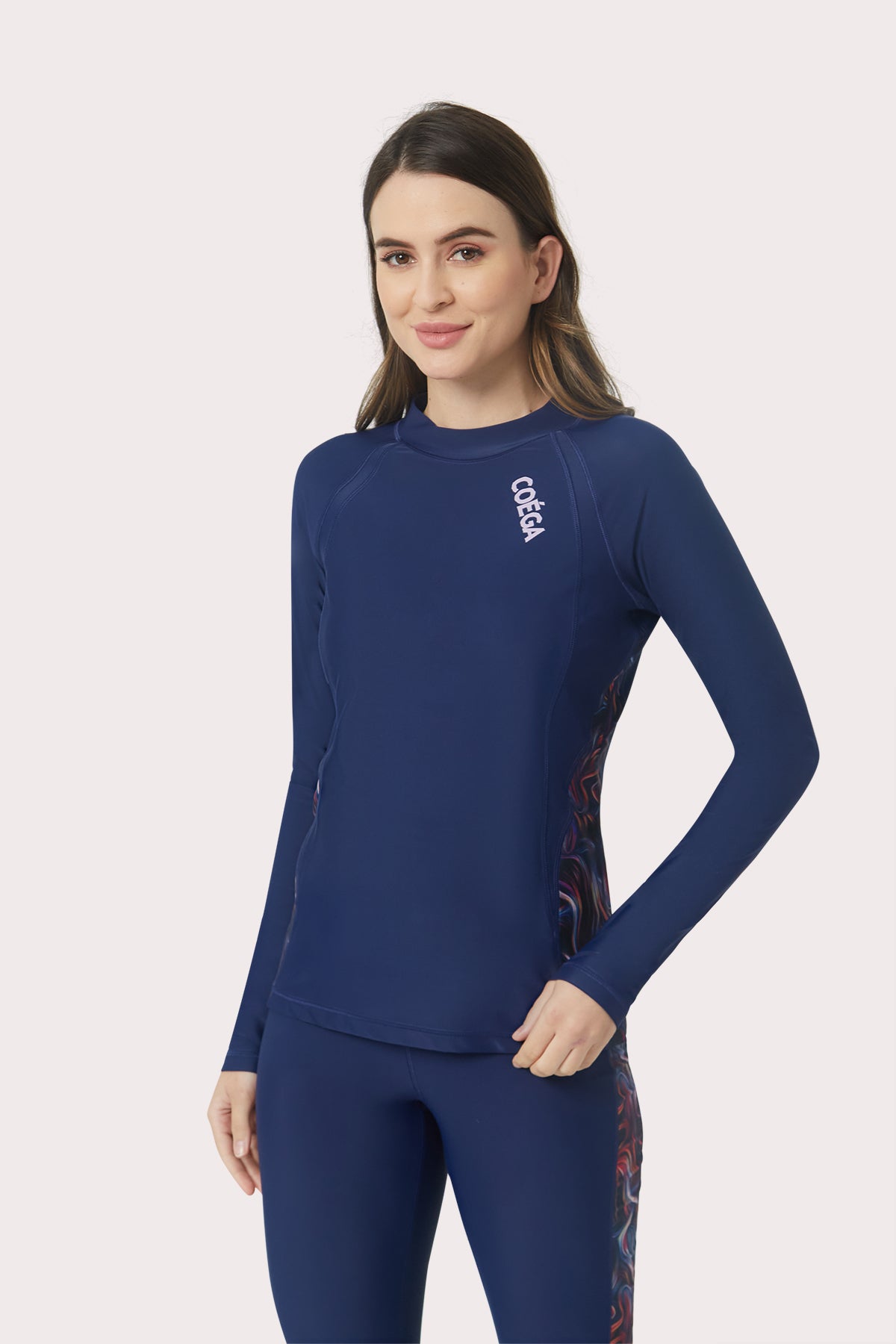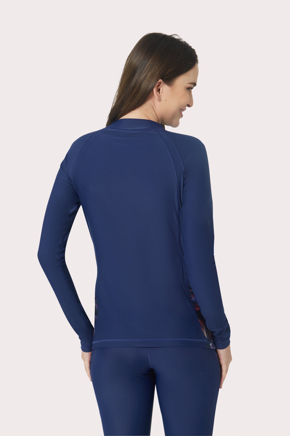 In an all-new colour pattern, this long-sleeve Rash Guard comes with a navy blue base with the all-new Navy Pink Swirls pattern along the sides, giving the Rash Guard a subtle pop of color that radiates elegance. This Rash Guard is made from stretchable and soft materials, this long-sleeved rash guard has a second skin feel, that you will never want to take off. Alongside this unmatched comfortability, this long-sleeve Rash guard has a built-in UV protection to ensure you stay protected against harmful UV rays whilst you enjoy all your aquatic adventures.