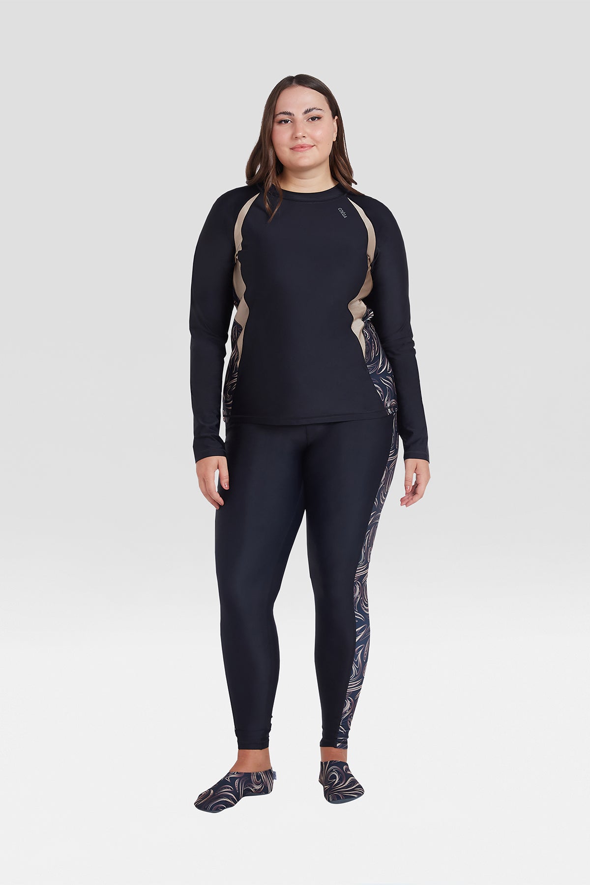 Models are wearing Ladies size UK 10 in Dusky Purple Textures color and UK 18 in Nero Golden Swirls.