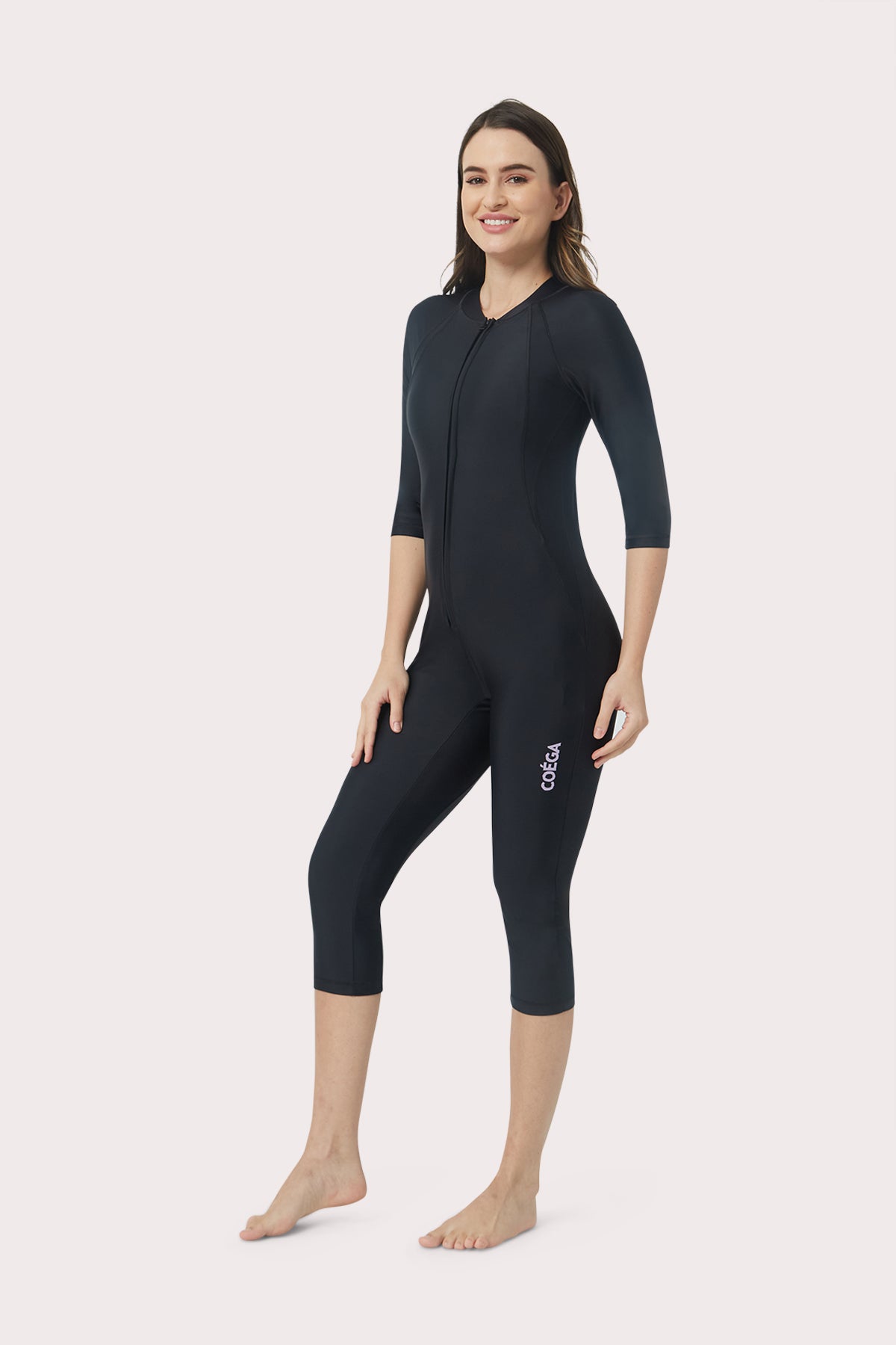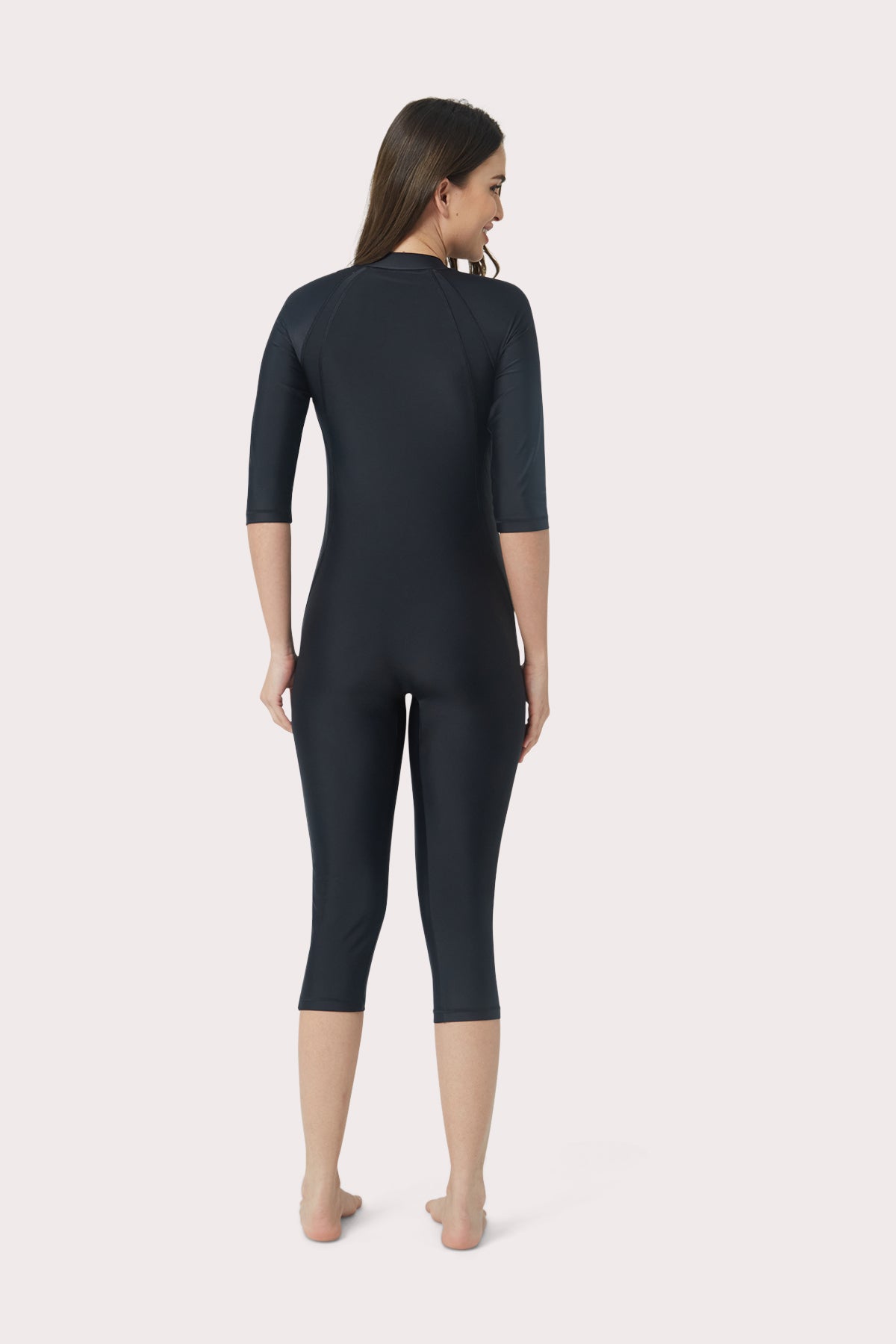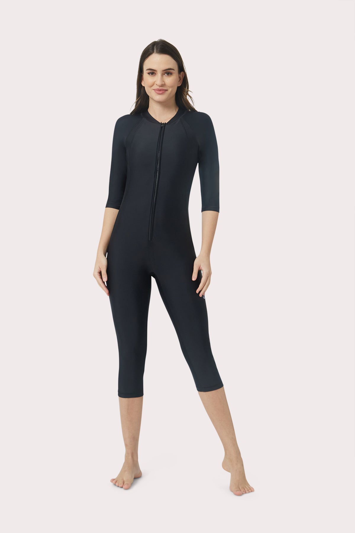 Our best-selling Slim-Kini in 3/4 length, the design of this unique one-piece suit gives an instant slimming effect. The 3/4 sleeves and 3/4 length legs provide coverage and sun protection where it’s needed. Sturdy front zip, built in support with bra padding, flat locked seams and side panels are all key to the high comfort and smooth lines of the garment.