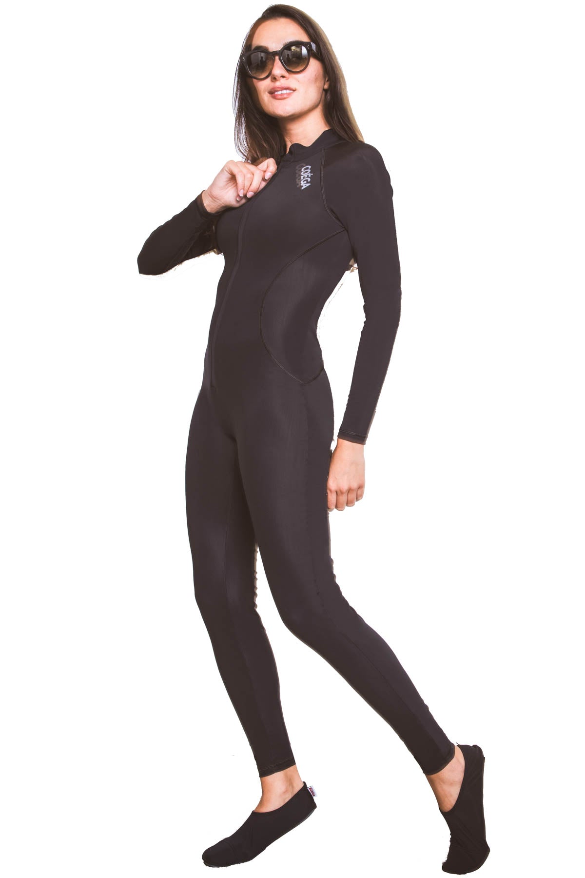 Our best-selling Slim-Kini in full length, the design of this unique one-piece suit gives an instant slimming effect. The sleeves extend to the wrists and legs to the ankles providing complete coverage and sun protection. Sturdy front zip, built in support with bra padding, flat locked seams and side panels are all key to the high comfort and smooth lines of the garment.