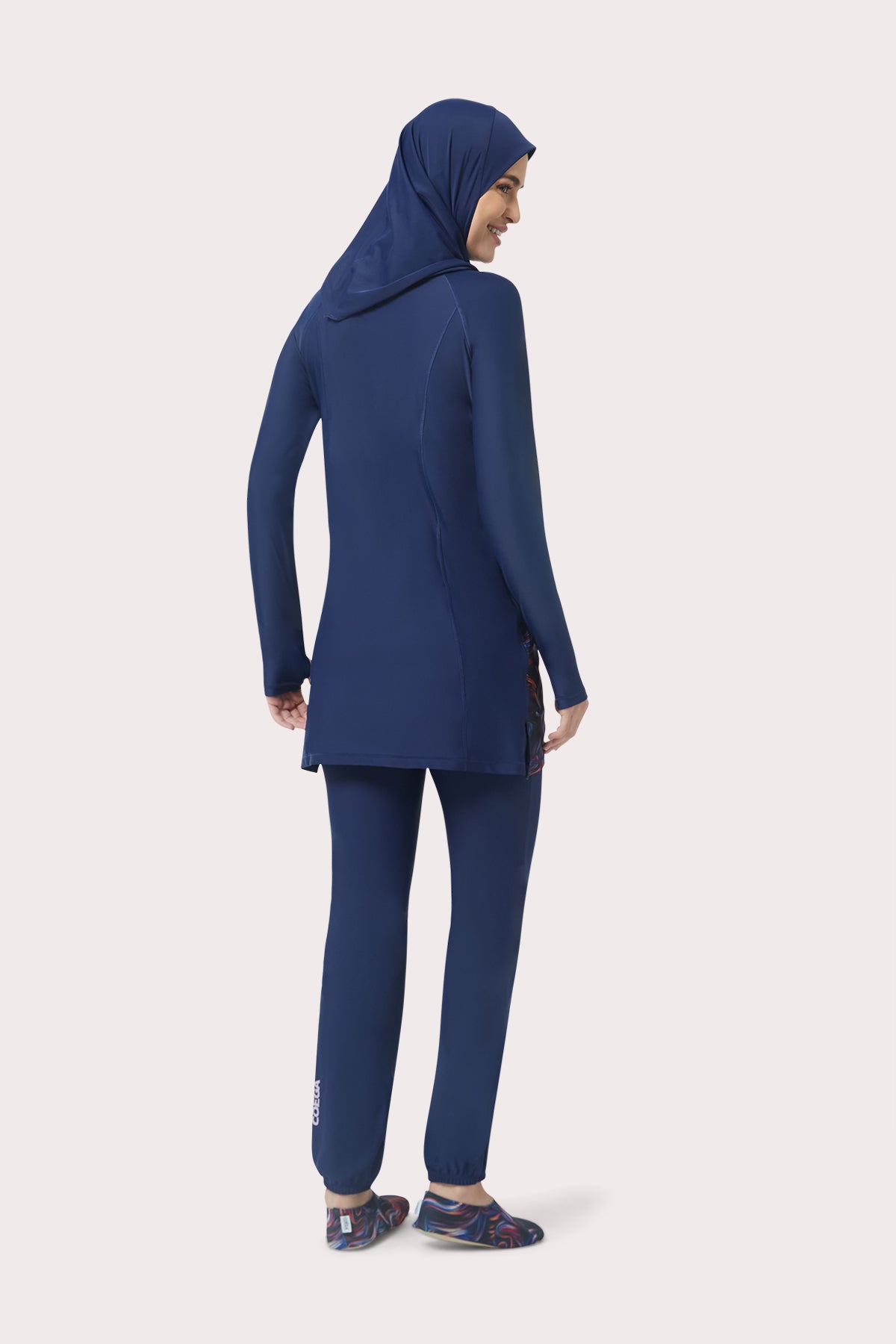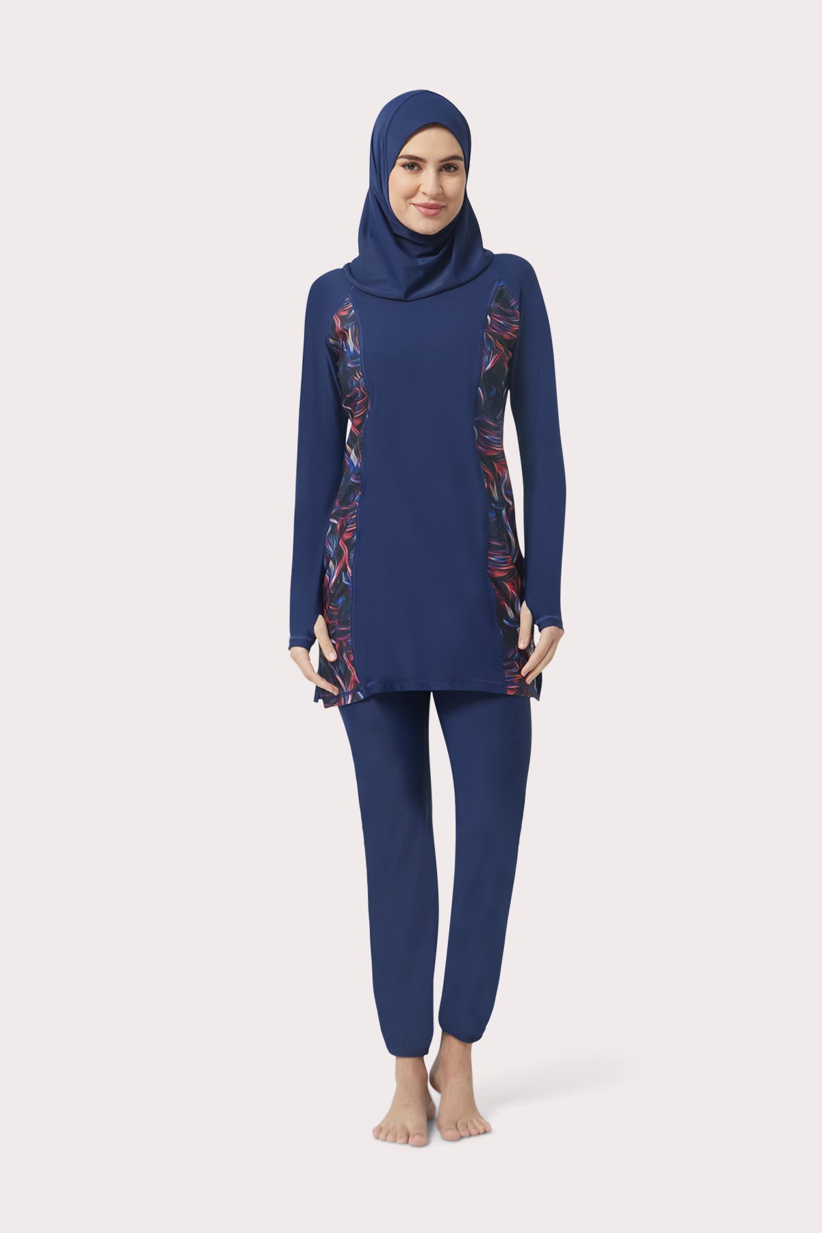 The ultimate modesty set. This unique 3-piece modesty set in all-new Navy Pink Swirls pattern includes full-length Swim Tights, Swim Tunic and Shaela. This set has been meticulously crafted by our in-house designers to balance comfort and elegance with premium quality fabric. Ideal for lounging by the poolside or aquatic activities, this versatile set provides a sophisticated and timeless look whilst offering excellent sun protection.