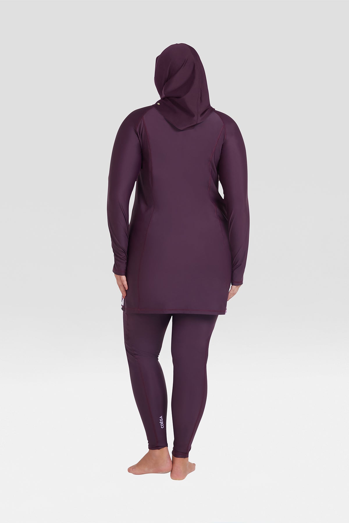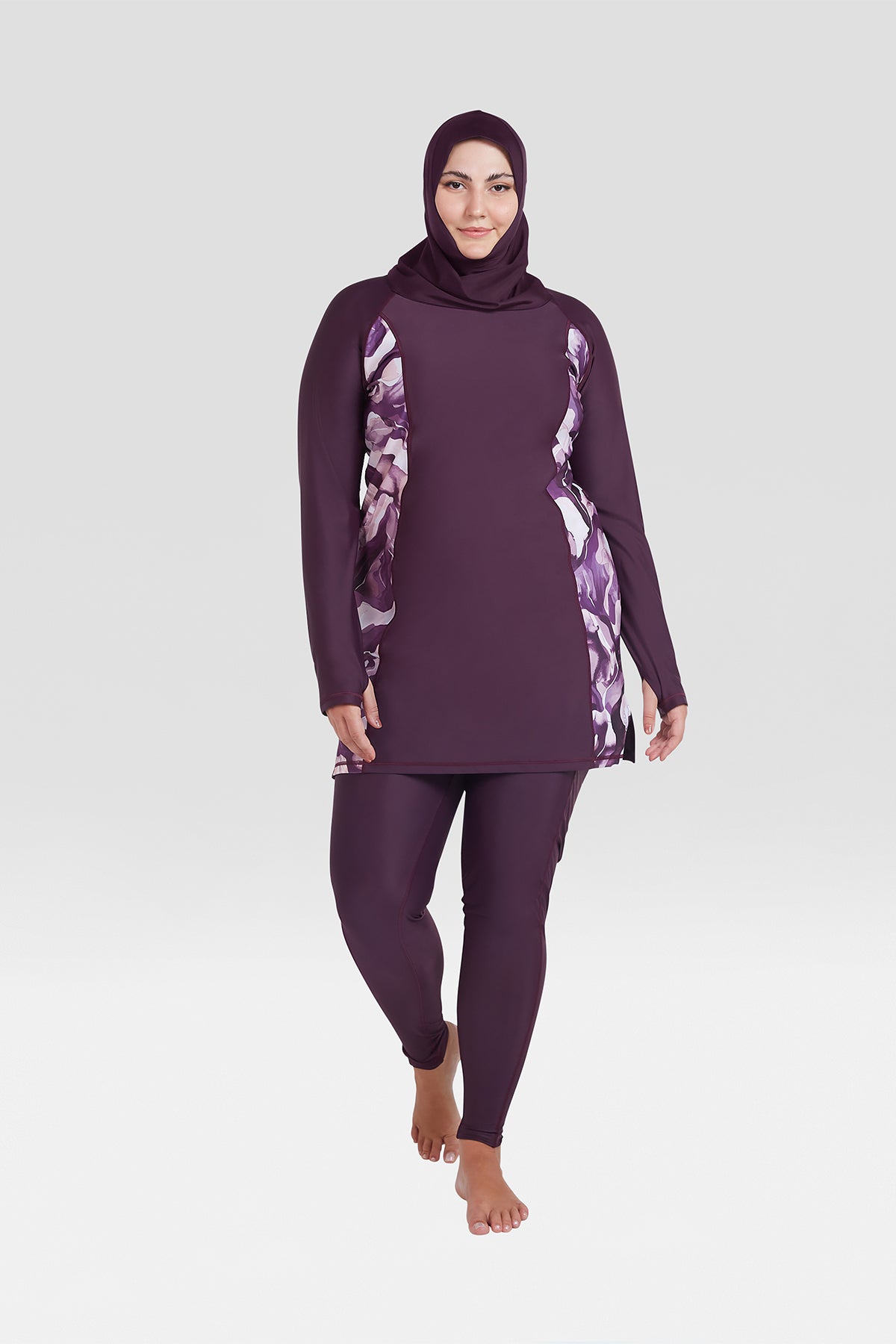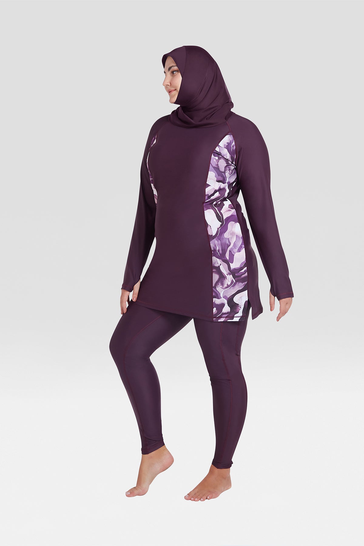The ultimate modesty set. This unique 3-piece modesty set in all-new Dusky Purple Textures pattern includes full-length Swim Tights, Swim Tunic and Shaela. This set has been meticulously crafted by our in-house designers to balance comfort and elegance with premium quality fabric. Ideal for lounging by the poolside or aquatic activities, this versatile set provides a sophisticated and timeless look whilst offering excellent sun protection.