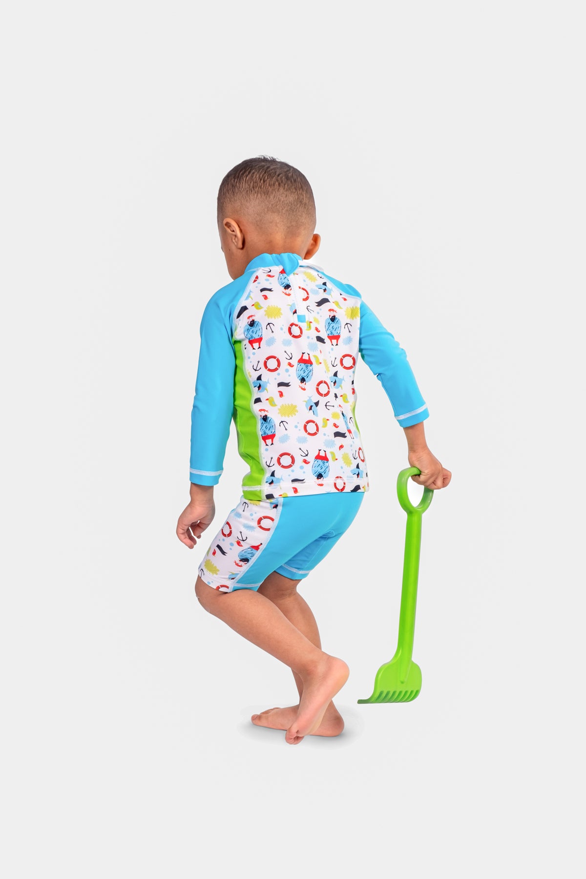 This convenient and unique two-piece design provides comfort and sun protection for your little one while enjoying the beach or pool. Stretchable and soft, the outfit includes a long-sleeve rash guard and matching swim shorts. The rash guard is designed with half zip in the back to allow for quick and easy access. The shorts have an elasticated waist for easy on/off and flexible fitting.