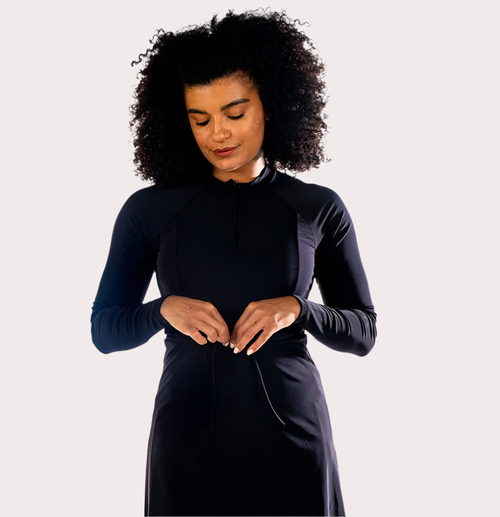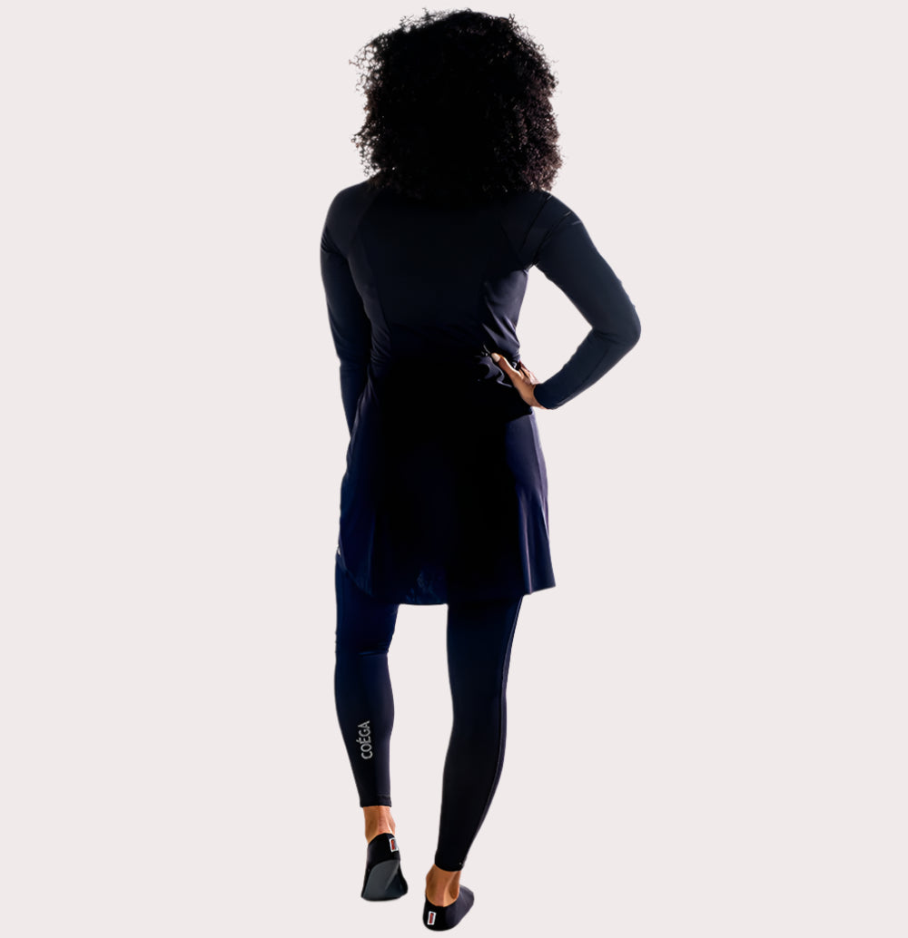 Stylish and Chic, the tunic has a graceful silhouette. The skirted tunic has built-in support with bra padding and is mid-thigh in length. Long sleeves with specially designed thumb holes help to keep sleeves down and allow freedom to move. Baby snaps on the inside seam secure the tunic to COEGA's full leggings or swim trousers to prevent flare ups. Mix and match with Tights or Trousers and Swim Shaela to suit your style. Go Ahead, Love the Sun!
